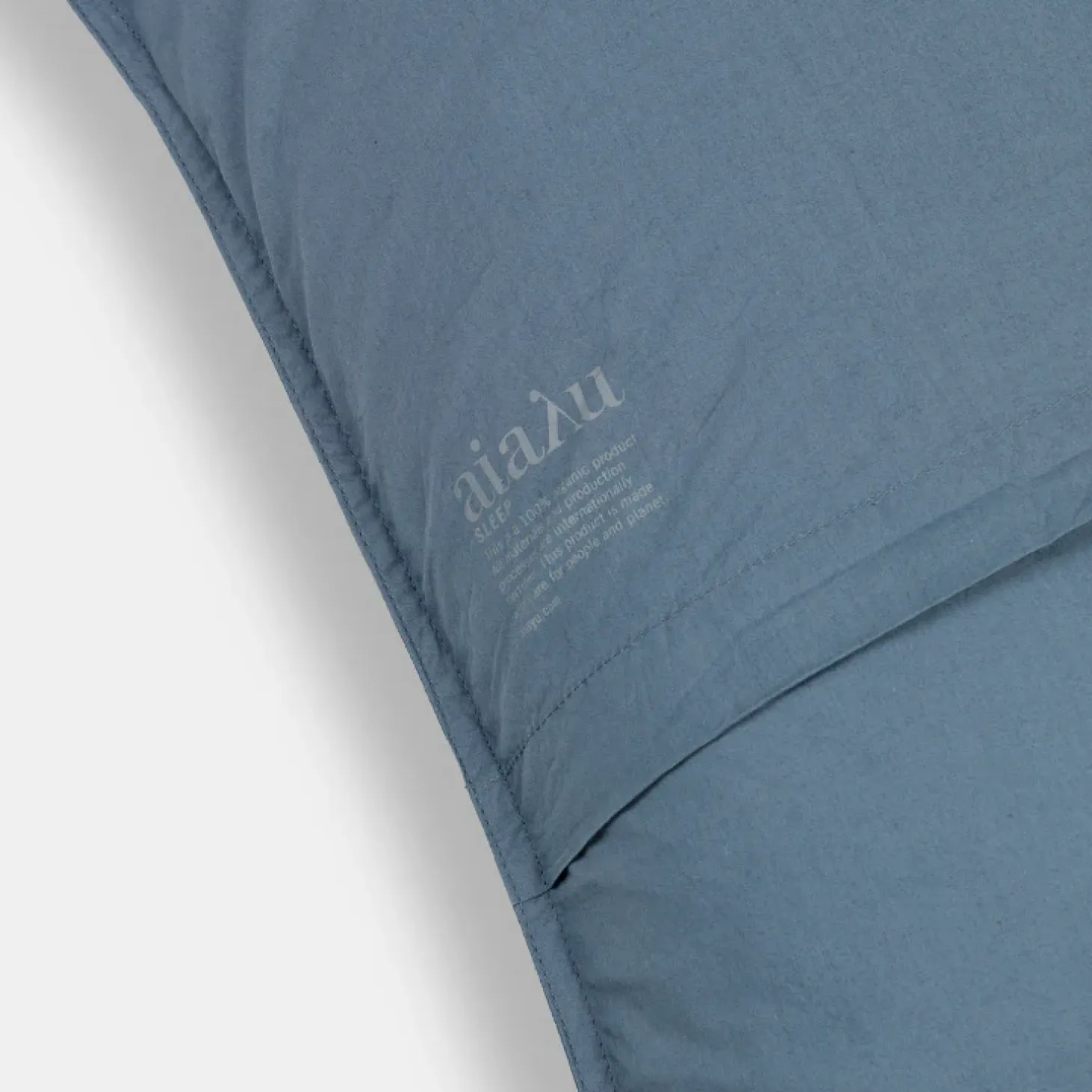 Farve: OceanStørrelse: 140 x 220 cm (+ hovedpude, 60 x 63 cm).Materiale: 100% økologisk bomuld. GOTS-certificeret.Vaskeanvisning: Ved maskinvask anbefaler Aiayu 30-40 grader og brug af miljøvenligt vaskemiddel. Undgå tørretumbling og blegemidler.