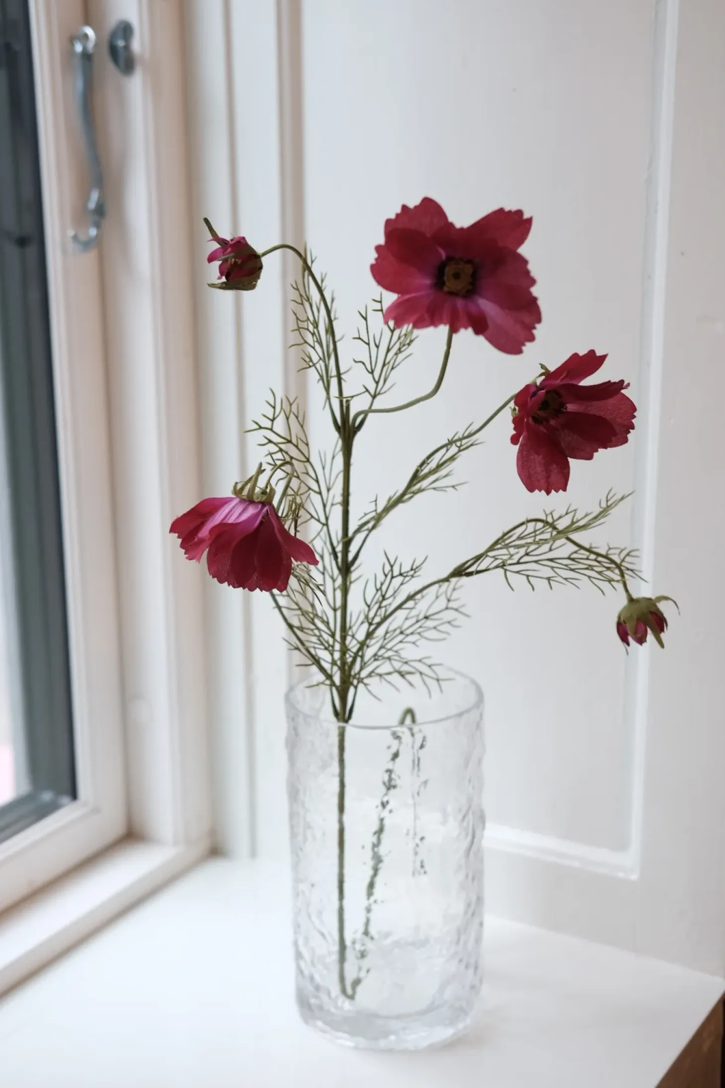 En meget fin lilla comos blomst (cosmos; betyder på græsk, smukke) – og det må man da virkelig sige at denne her er! Vi elsker blomster, men vi får ikke hele tiden købt nye eller også har vi ikke tid til at skifte vand og passe ordentligt på dem. Derfor er vores udvalg af blomster stort og passer til den nuværende smag og årstid.