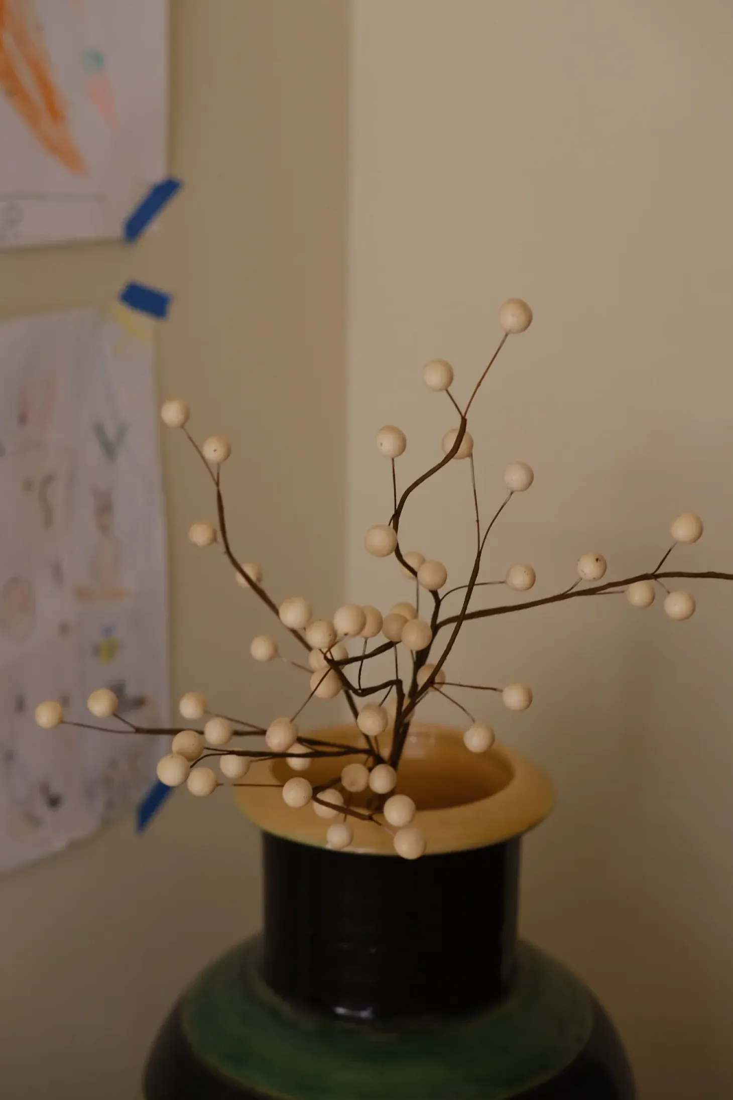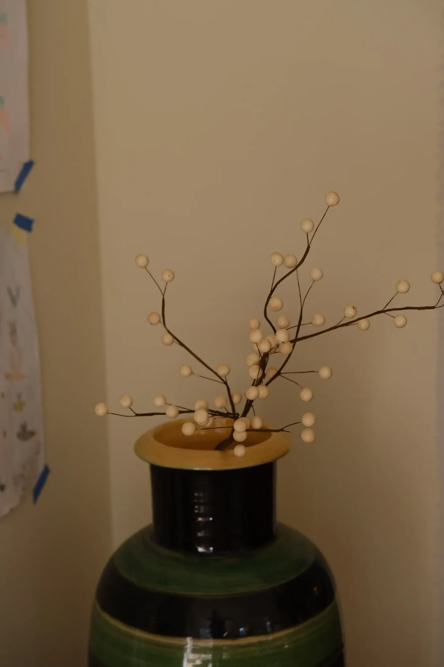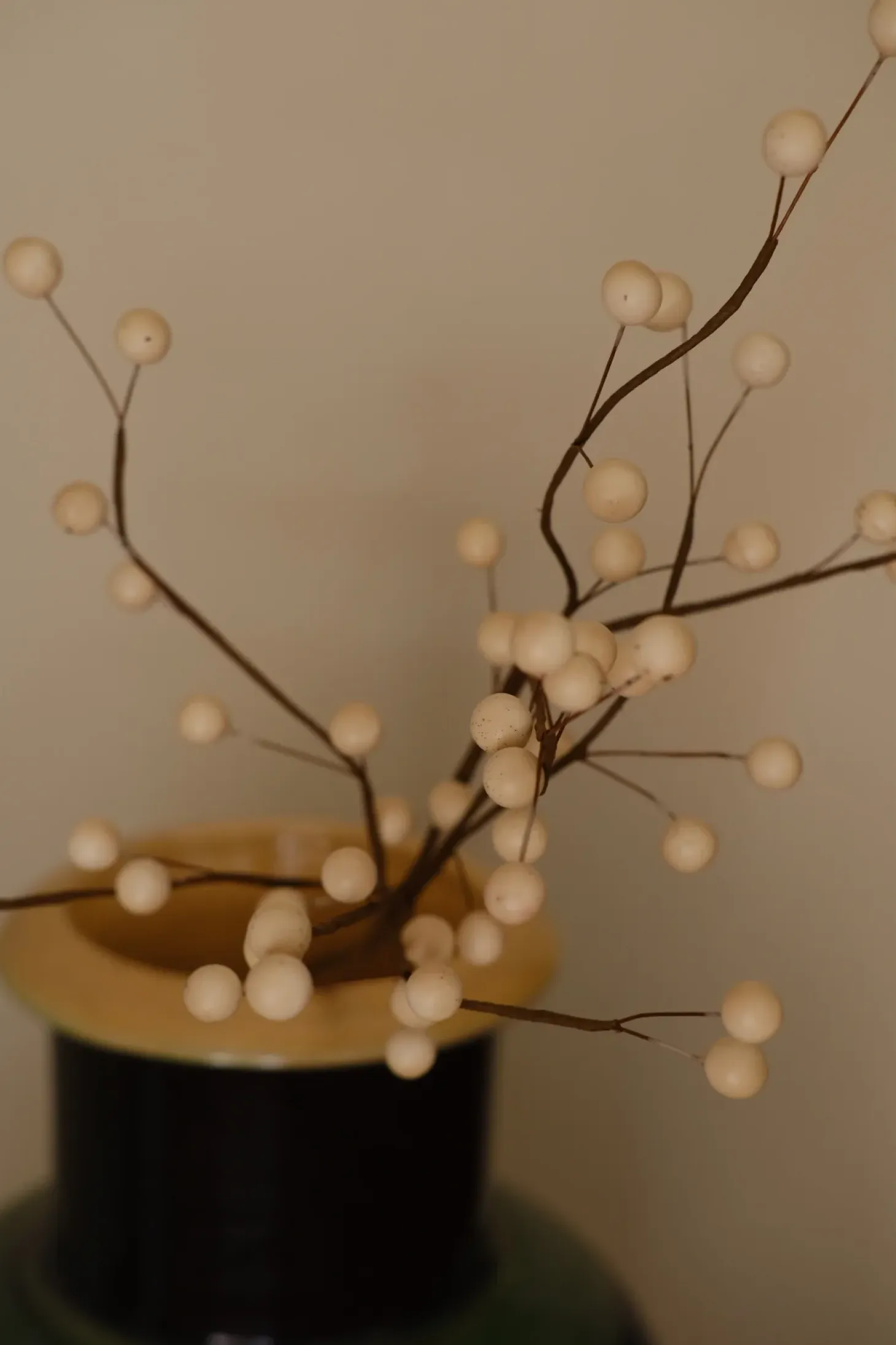 En gren med hvide bær. Kan enten bruges i buketten, om adventskransen eller som bordpynt. Den kan jo klippes i, så man får enkelte klaser.