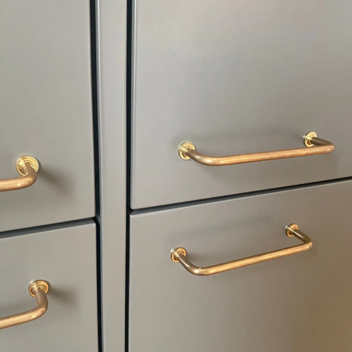 Super fine bøjlegreb i upoleret messing med trappet fodskive, hvilket tilføjer elegance til det klassiske greb.