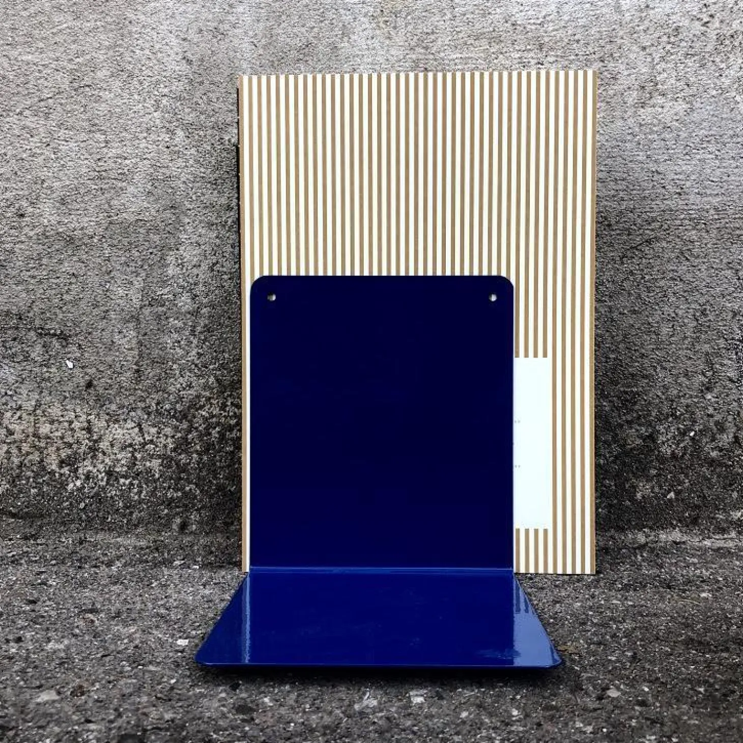 Italiensk bogstøtte i lakeret metal i mørk, klar blå. Bogstøtten er lavet med skruehuller, så den også kan bruges som en lille hylde, f.eks til nøgler eller en toiletrulle, på din gallerivæg med en vase eller til smølferne på børneværelset. Hylden / bogstøtten findes i mange fantastiske farver, og denne dybe blå er ret flot.
