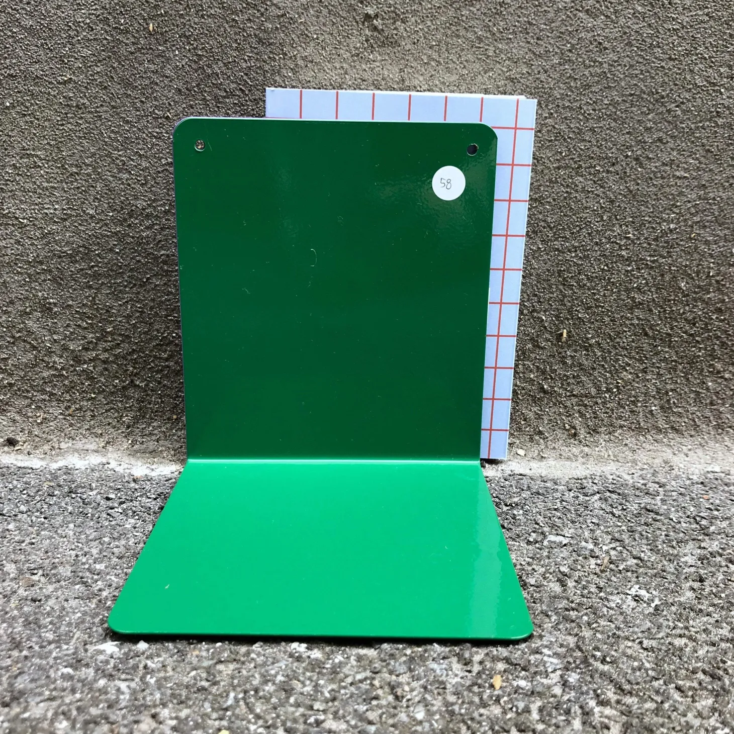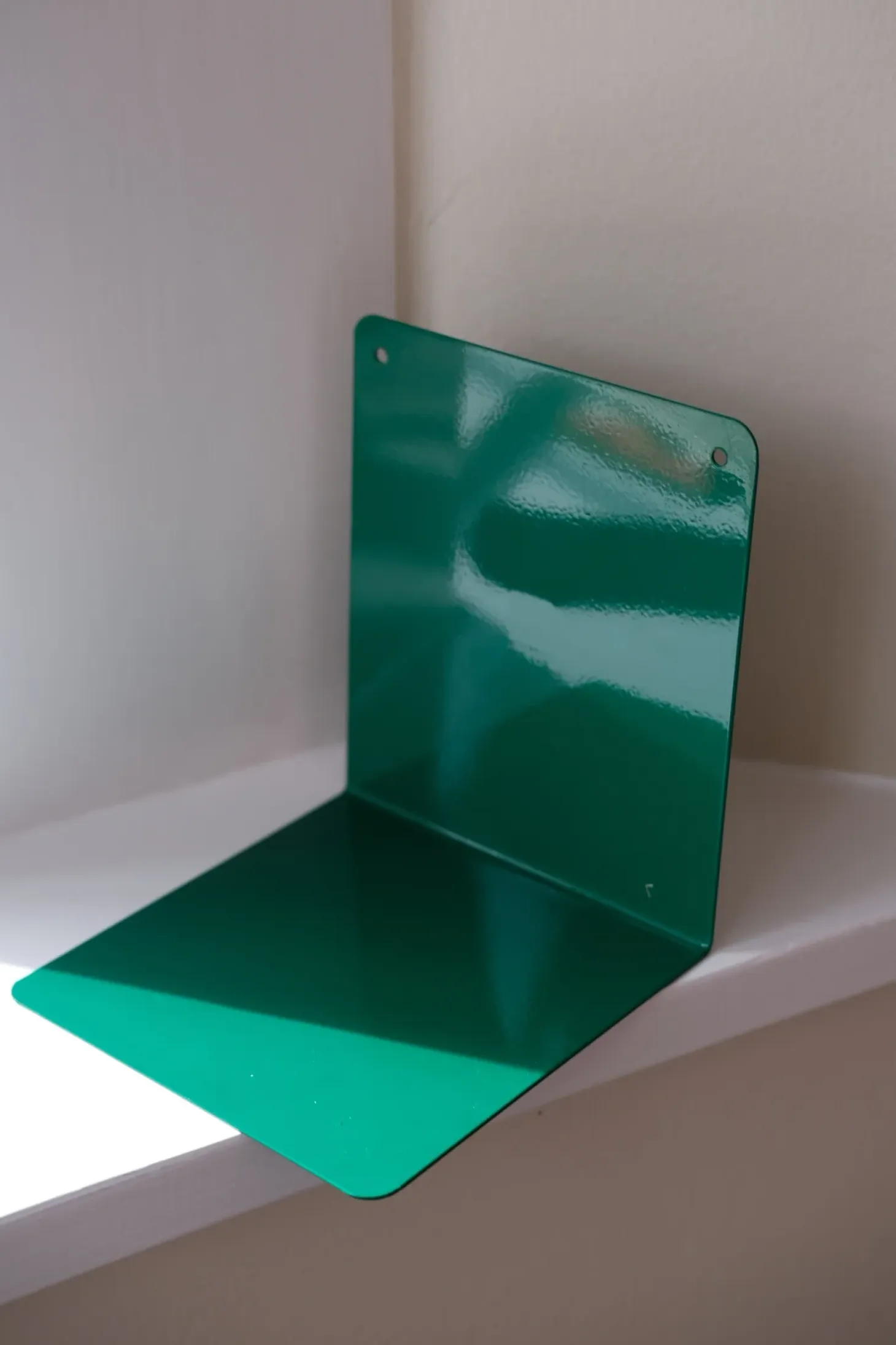 Bogstøtte produceret i Italien i lakeret metal i en klar grøn farve. Bogstøtten er lavet med skruehuller, så den også kan bruges som en lille hylde, f.eks ved sengen til et vandglas, til en plante, til entreen til nøglerne eller til yndlings dimsen på børneværelset. Hylden / bogstøtten findes i mange fine farver, og den grønne her er virkelig flot.