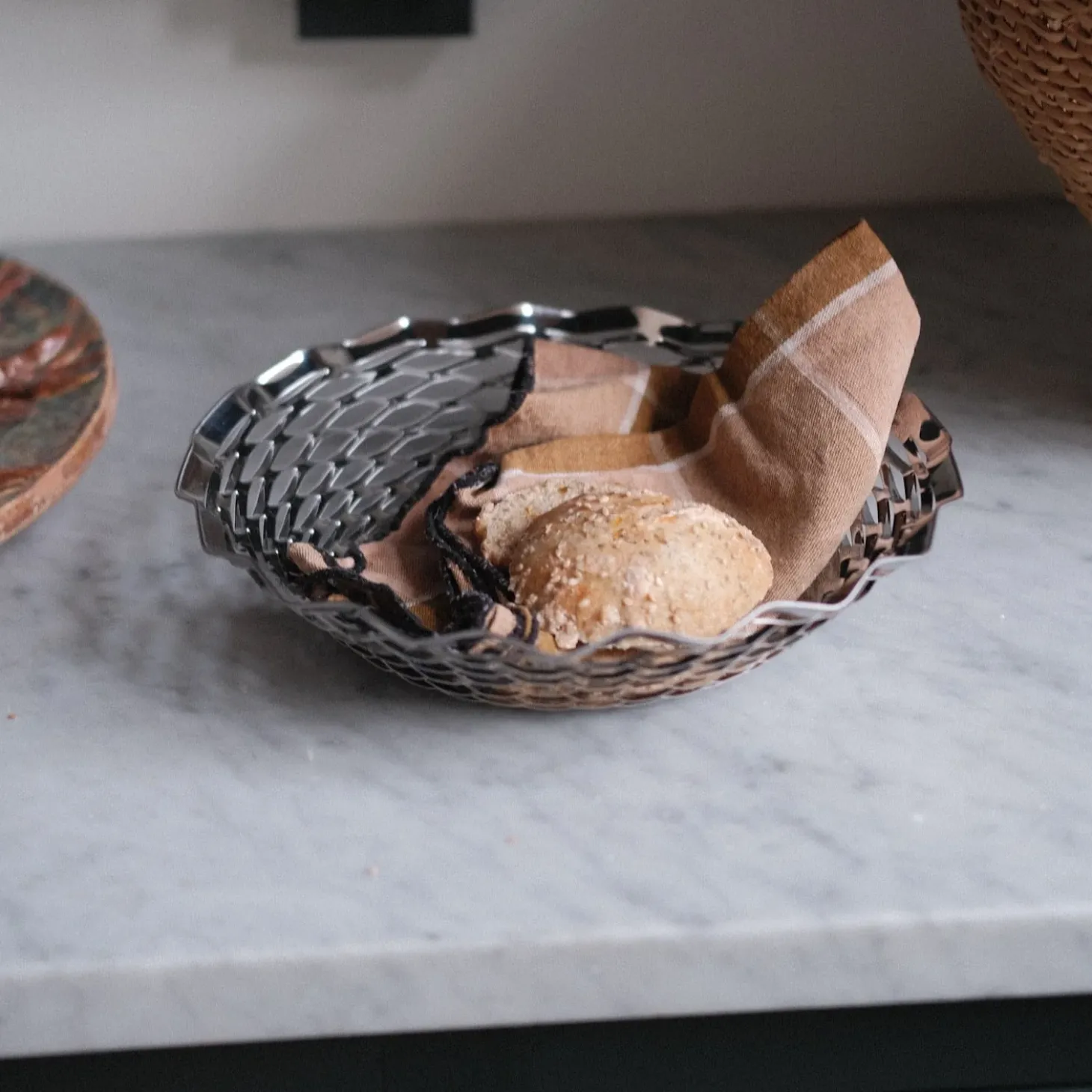 En brødkurv presset ud i rustfrit stål. Den er cool og fin på samme tid. Brug til brød, frugt, kager og anden servering.Roger Orfevre er fransk og deres vare har en skøn attitude. Vi er vilde med det kolde stål og den organiske form.