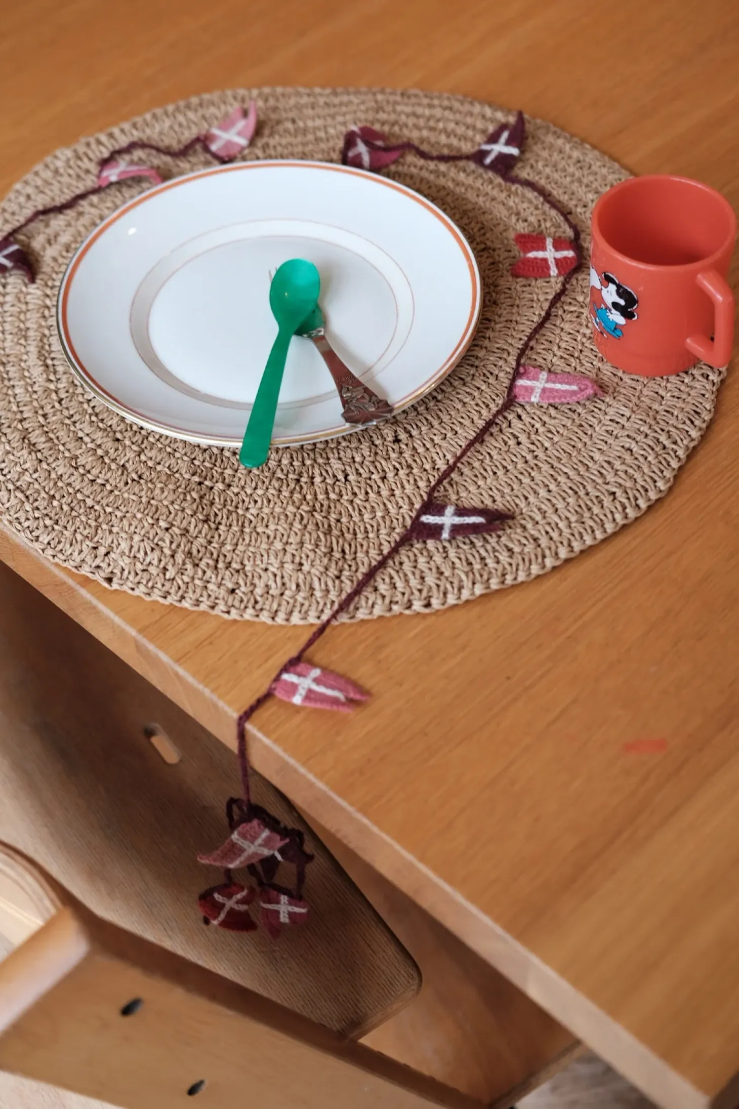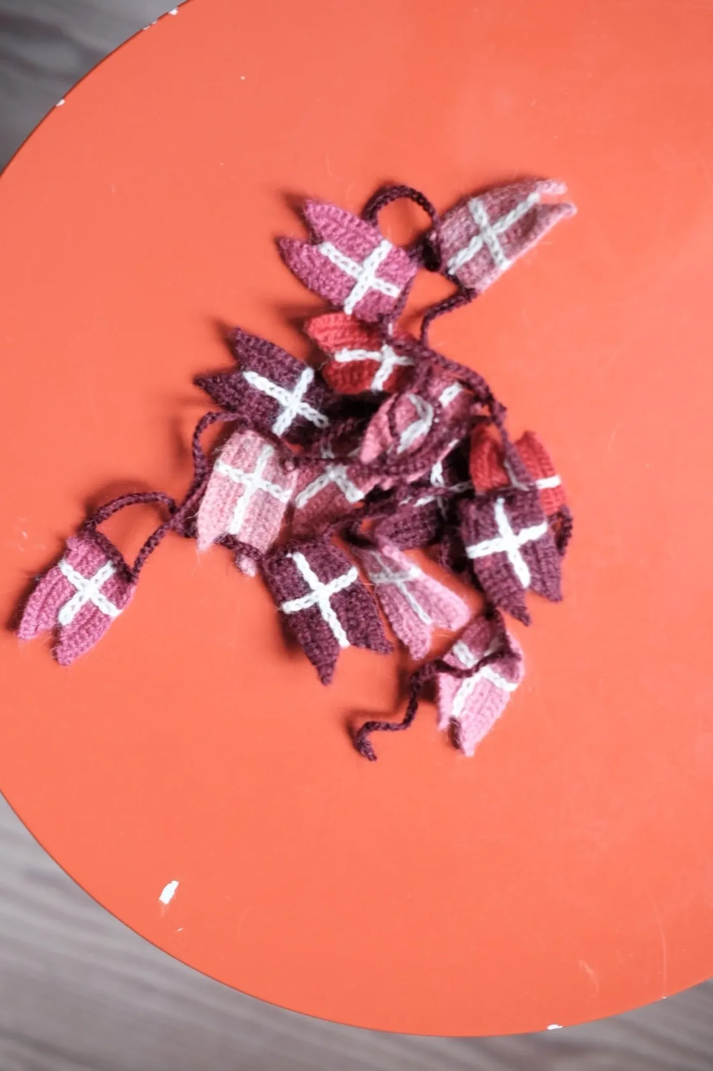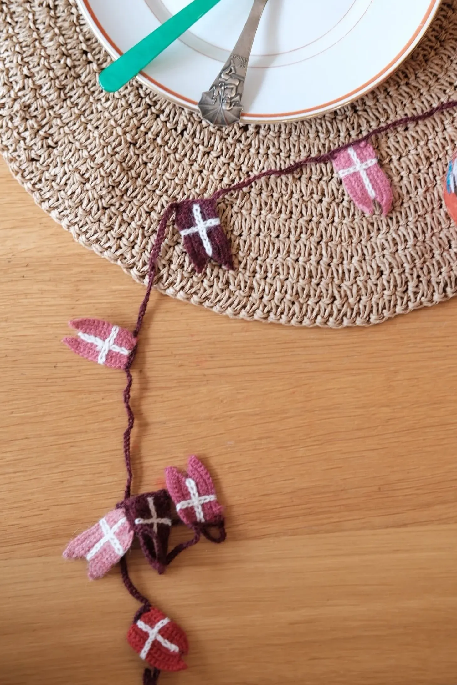 En hæklet flagranke, som kan bruges på børneværelse, dekorativt på juletræet eller til fødselsdage.