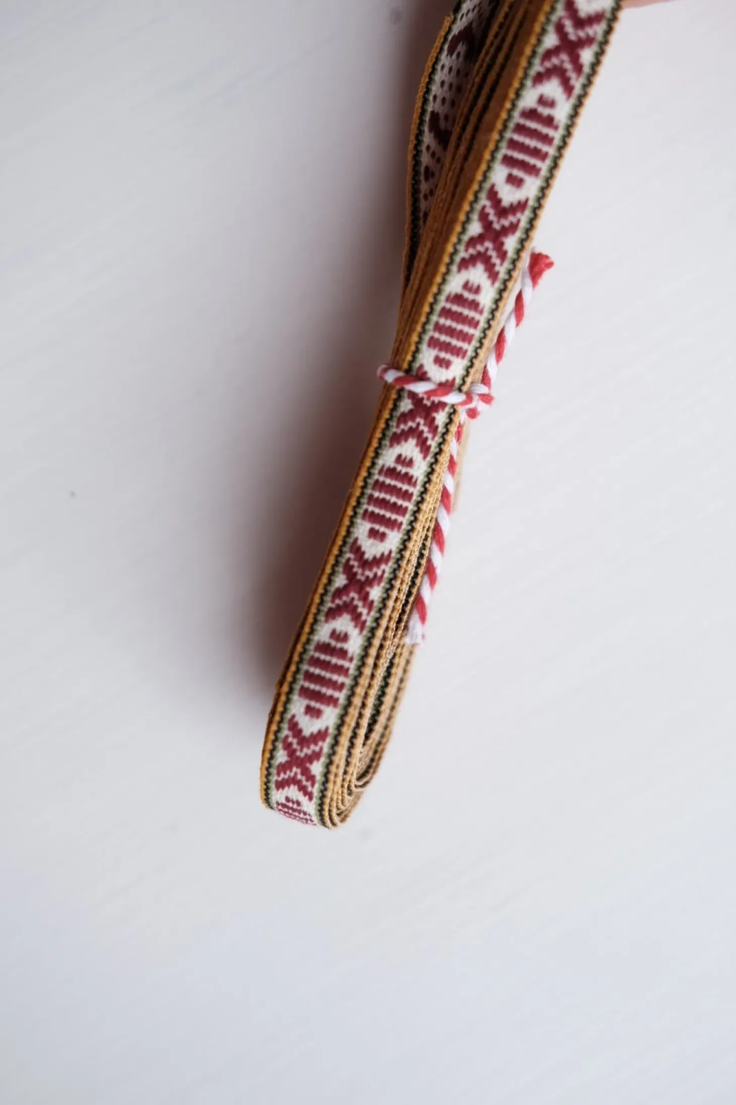 Gavebånd i bomuld med svenske mønstre. De er alle nogle ret flotte farver. De kan bruges til at pakke gaver ind, men også hænge julepynt op i.