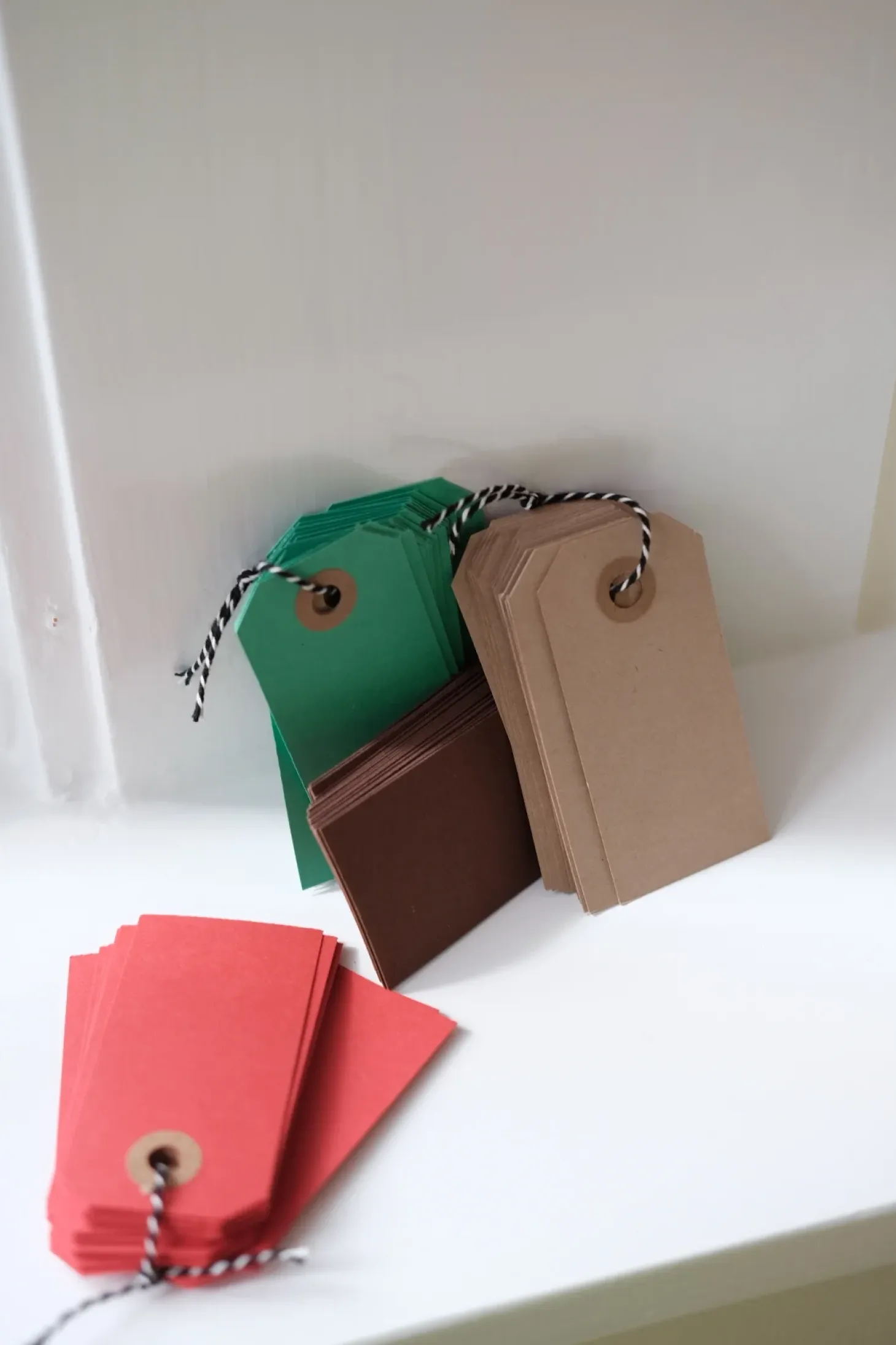 Gavemærker i forskellige farver. De er lige til at sætte på pakkerne med et bånd.