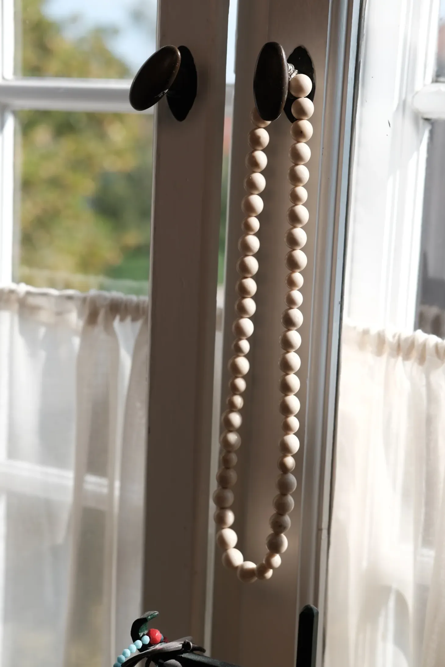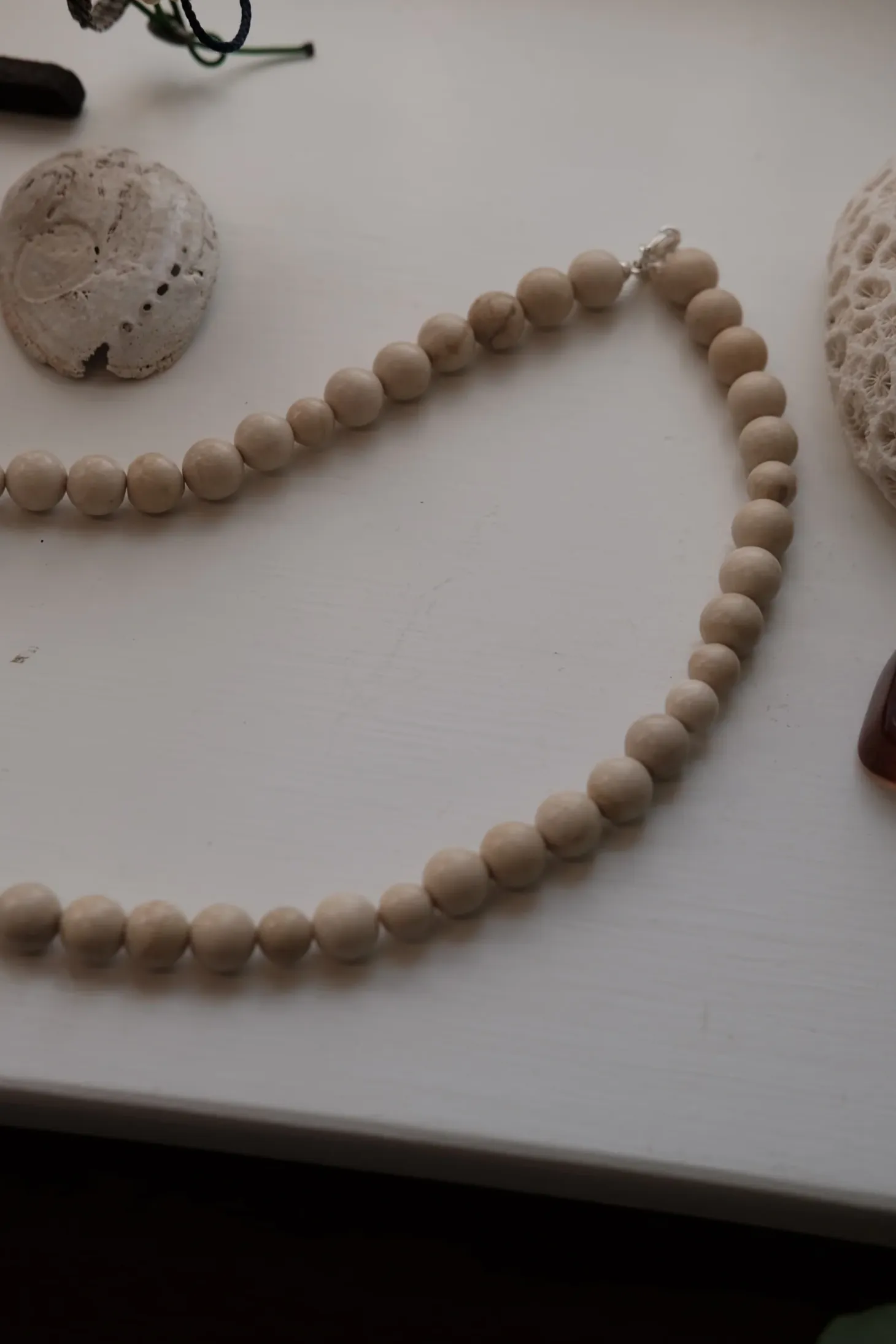 En markant halskæde lavet i højkvalitets halvædelstenen hvid fossil. Den mælkehvide sten varierer i farve. Vi synes den har karakter og er super cool til alt fra en t-shirt til den festlige garderobe.Smykkerne er håndlavet i Holland af et lille team på Labros atelier.