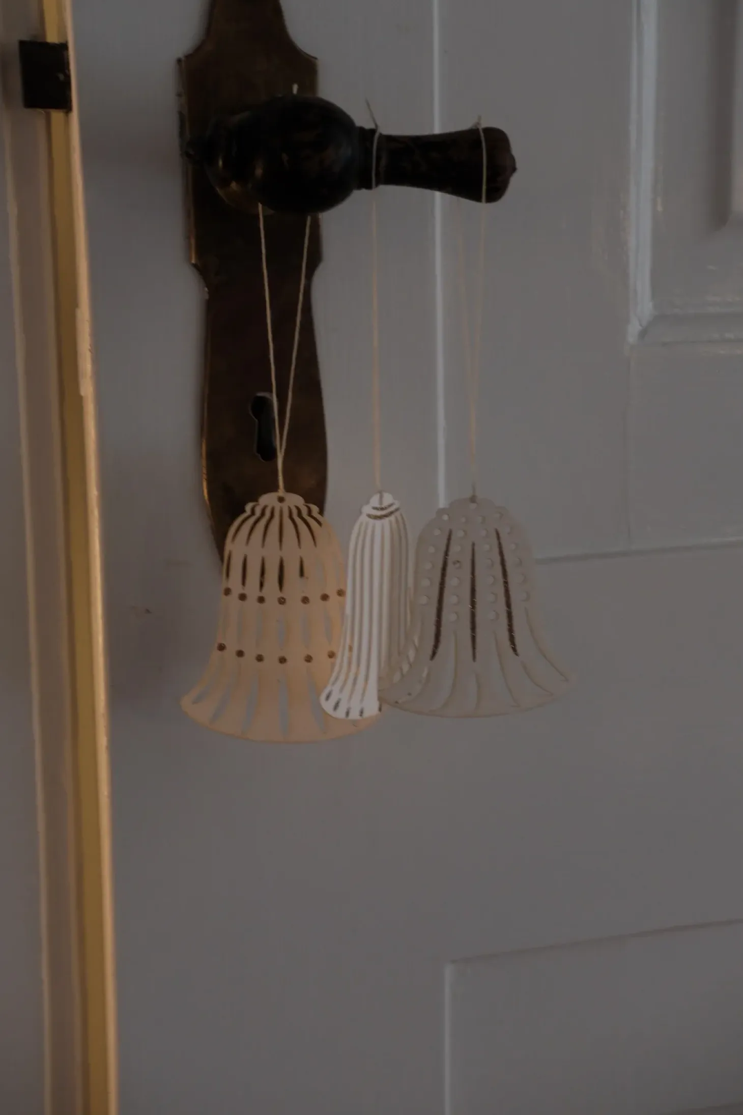 Hvid papir julepynt i form som klokker. Skøn på en pakke til jul, på træet eller andet sted.Der kommer 3 stk i en pakke.