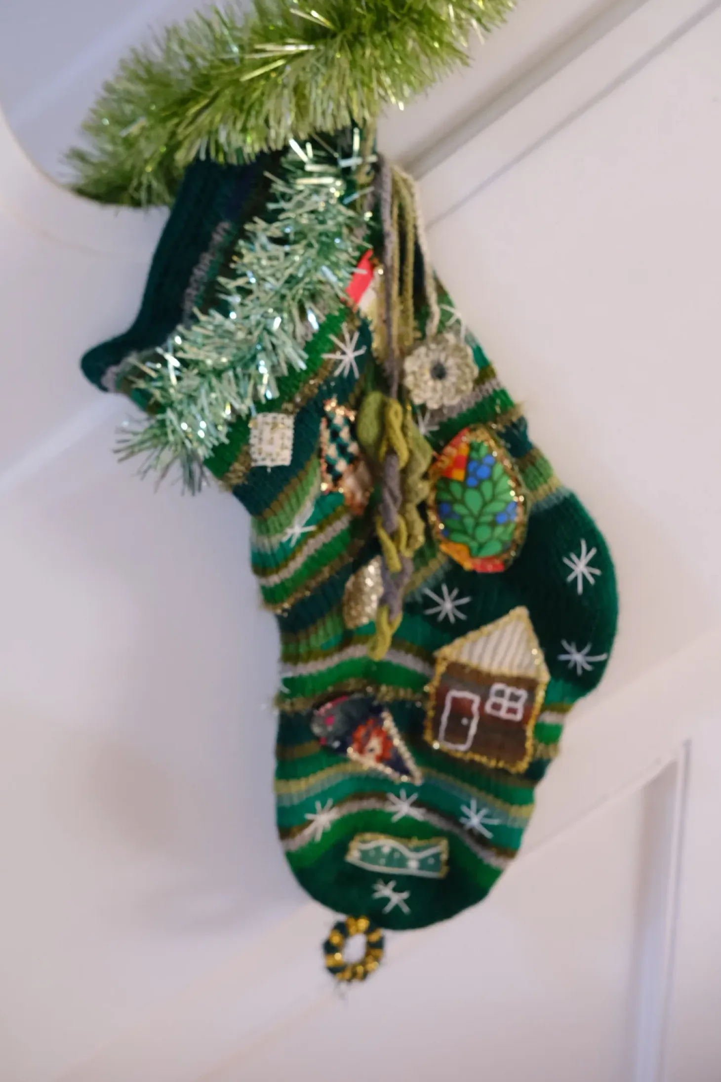 En strikket unik julesok i grønlige nuancer med masser af ornamenter og dekorationer på. De er hver især unikke med påsyede dekorationer af hjerter, julebukke, slikstoke, lys etc på hver side. Der er også en hank så den nemt kan hænges op.