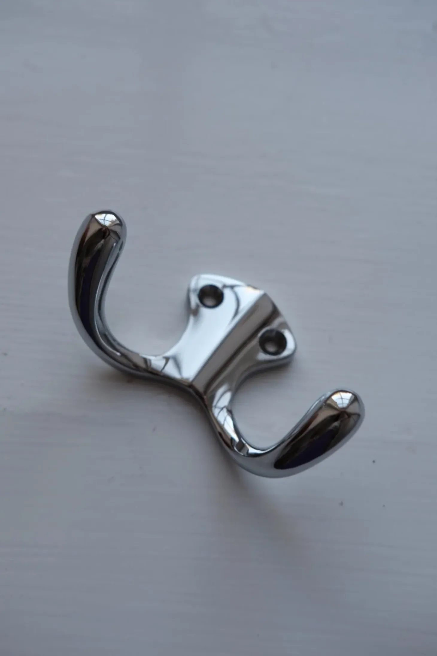 En knage med to kroge i krom uden lak. Det er et meget klassisk ophæng, som kan bruges både i entreen til jakker eller i viskestykker i køkkenet. Den er enorm praktisk for den fylder hverken fysisk eller visuelt. Den er bare helt enkel og fin.