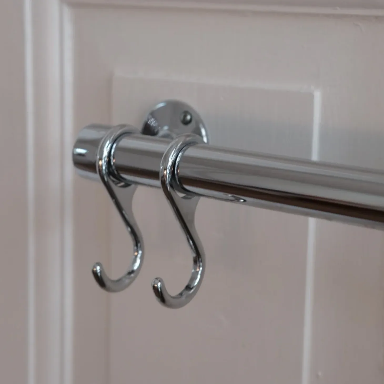 En stang i krom på væggen til opbevaring og ophæng af gryder, håndklæder eller frakker. Den kan bruges i både køkken, badeværelse og entre. Mulighederne er mange og den vil altid kunne bruges et sted i dit hjem. Her i butikken har vi den til viskestykker og håndklæder i vores te-køkken. Derhjemme har jeg brugt den i entreen til børnejakker.