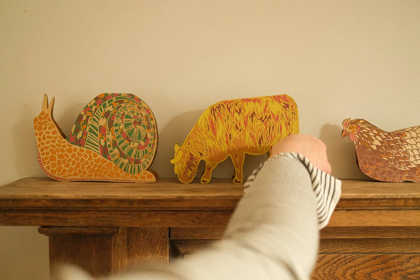 Farver: Primært okker og detaljer i lime og røde farver.