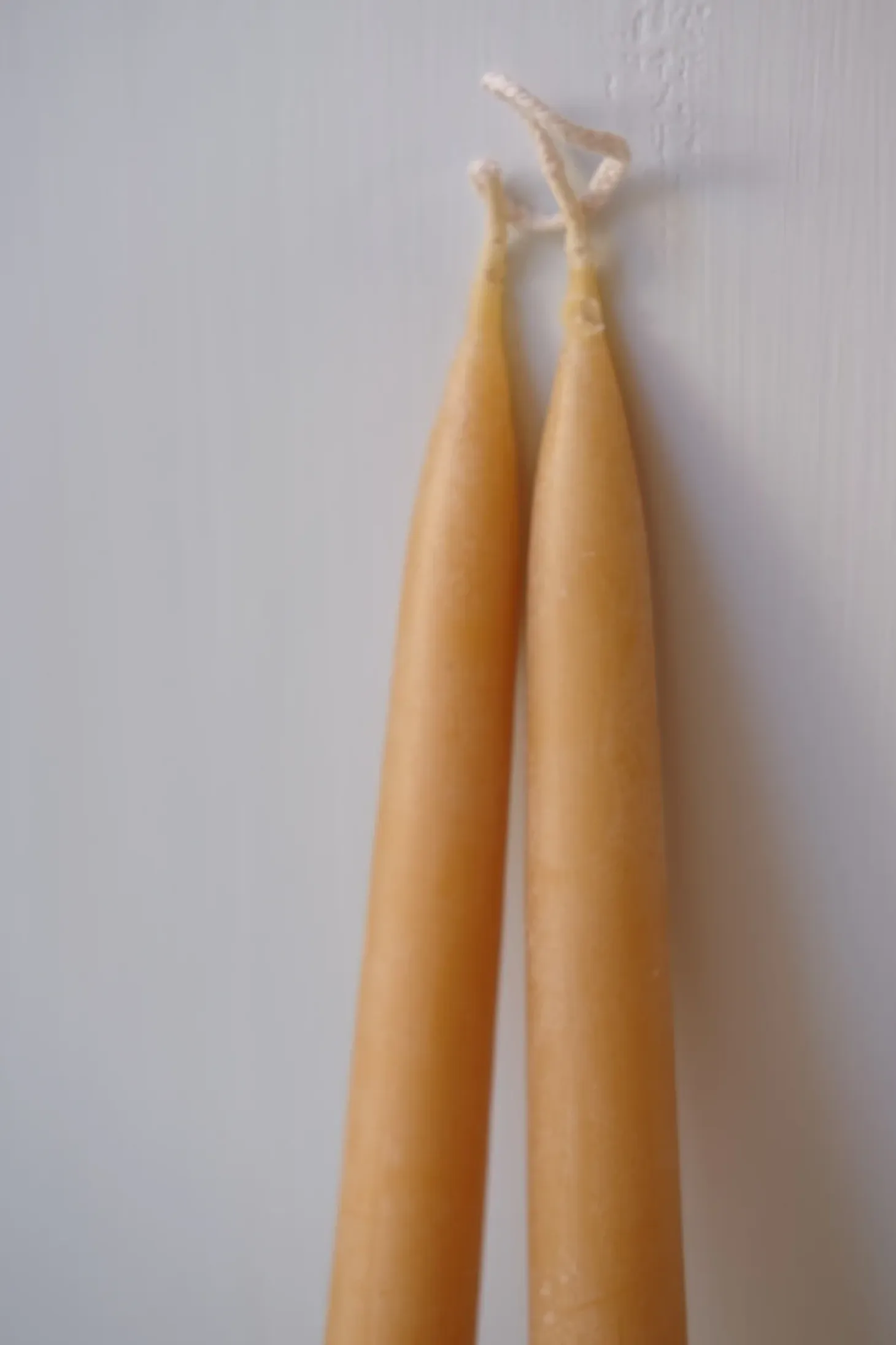 Hånddyppede stearinlys i bivoks produceret i Århus. De brænder uden at sode unødigt og så brænder de længe. Dette er et klassisk kronelys.