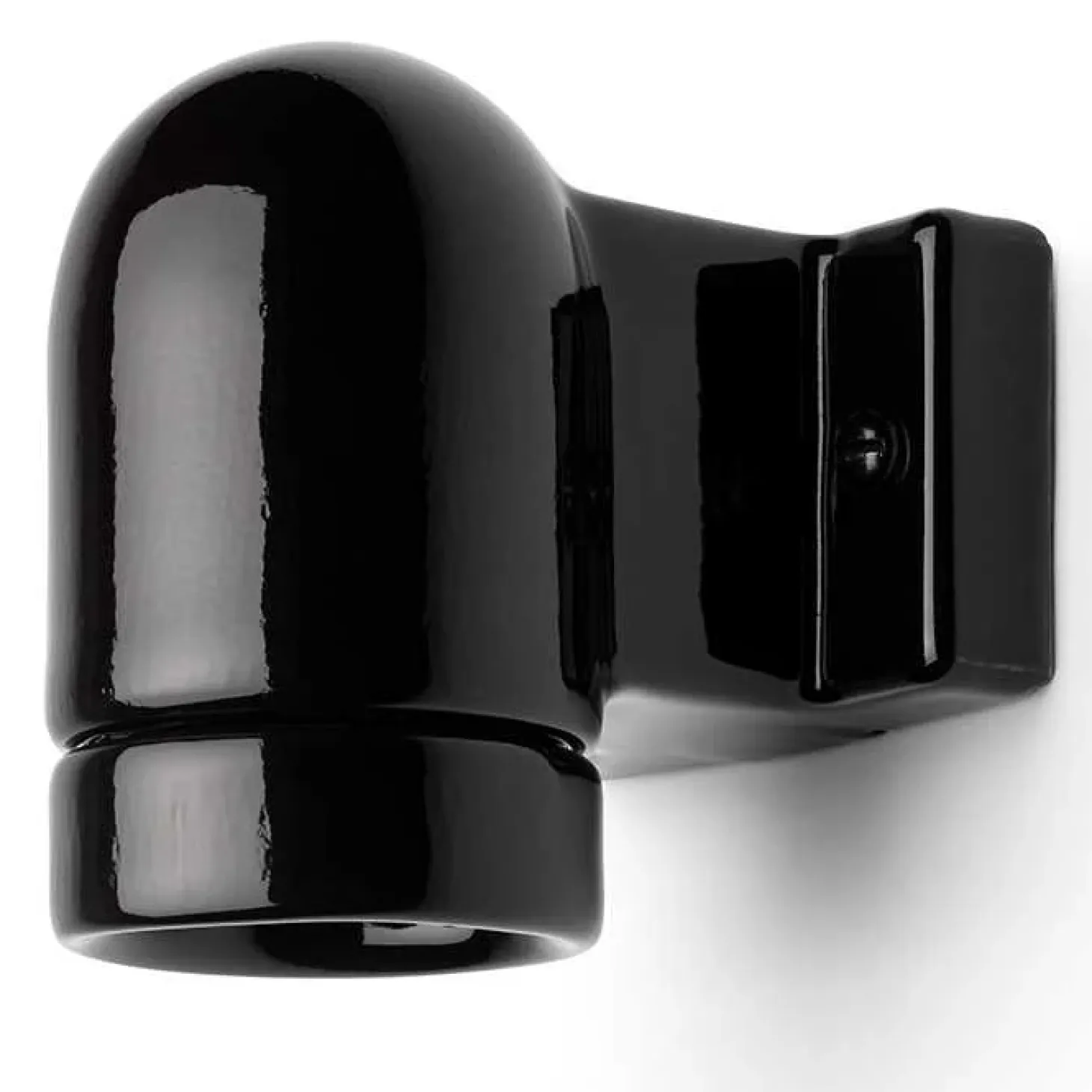 En sort porcelænslampe til væggen der er designet i 1930’erne. Det er en fordel hvis ledningerne kommer ud samme sted, således at lampen dækker direkte over ledningerne.