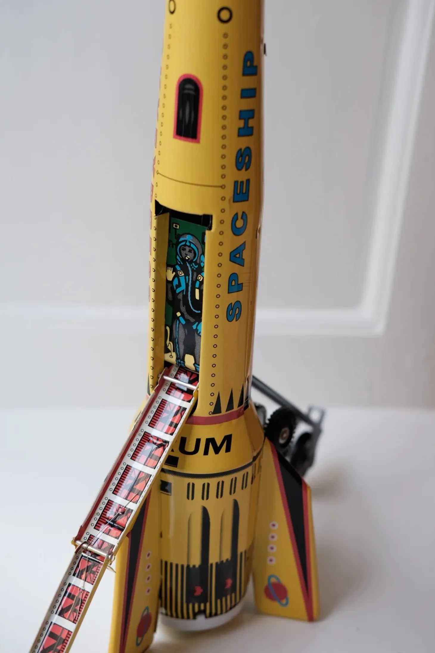 En klassisk raket med gule detaljer. Vi er helt vild med den – både til børn og voksne. Raketten har et friktionsdrev, hvis du skubber den på hjulene og lader den køre foran en forhindring, retter den sig op, og stigen falder ned og afslører astronauten. Hvor skønt er det lige?!