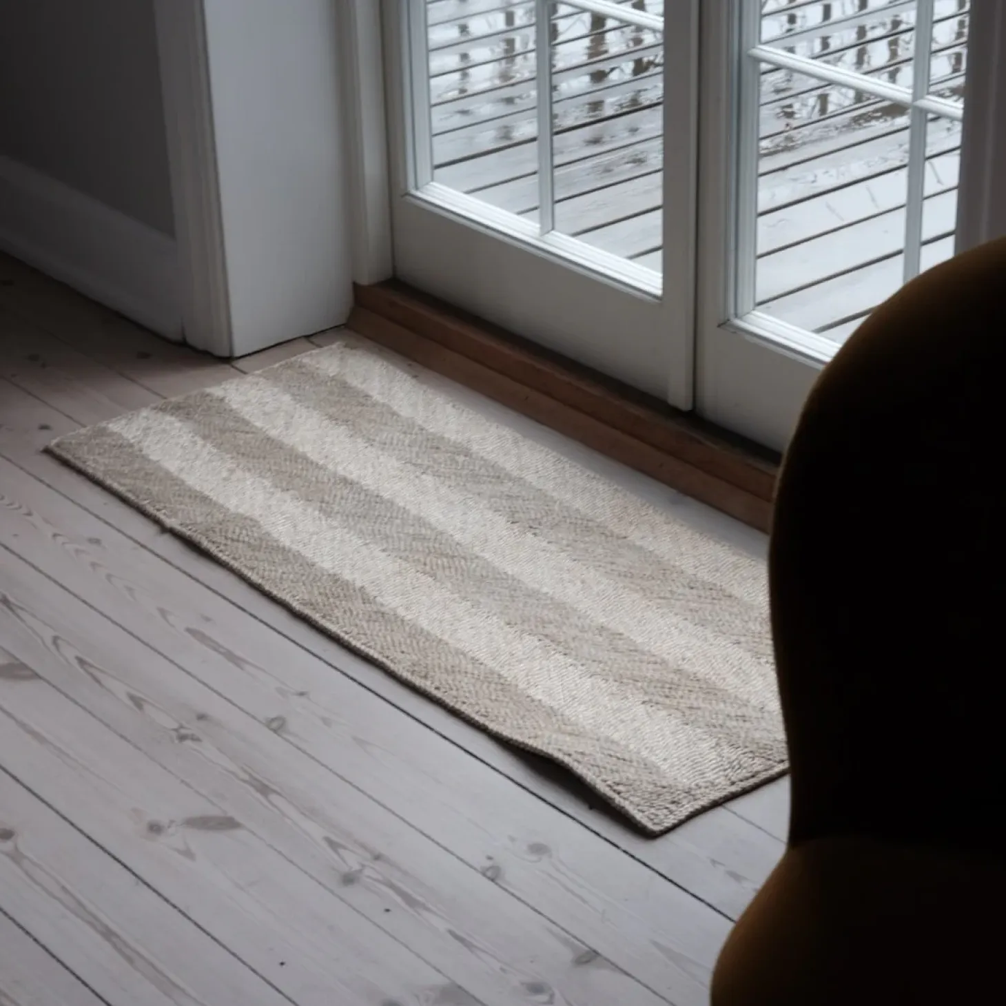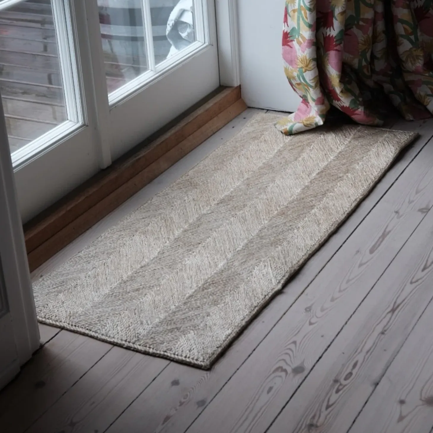 En måtte foran døren i et chevron mønster. Vi er helt vilde med den og kan godt lide at der sker noget. Og så har den en virkelig god størrelse og kvalitet!
