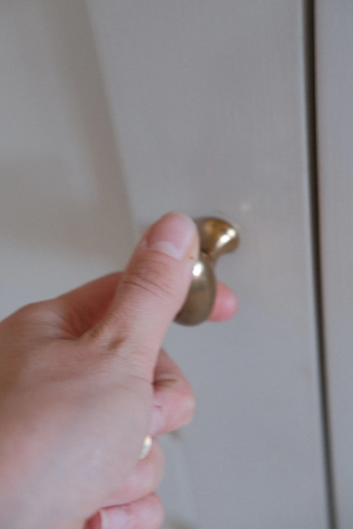 Mandelformet knage i messing uden lak.Måler 3,5 cm i længden, 2cm i bredden og 3,5cm i dybden. Skruer: Skrue medfølger, skriv i kommentaren om du skal bruge grebet i væg eller på låge/skuffeFås også i bruneret messing og krom.