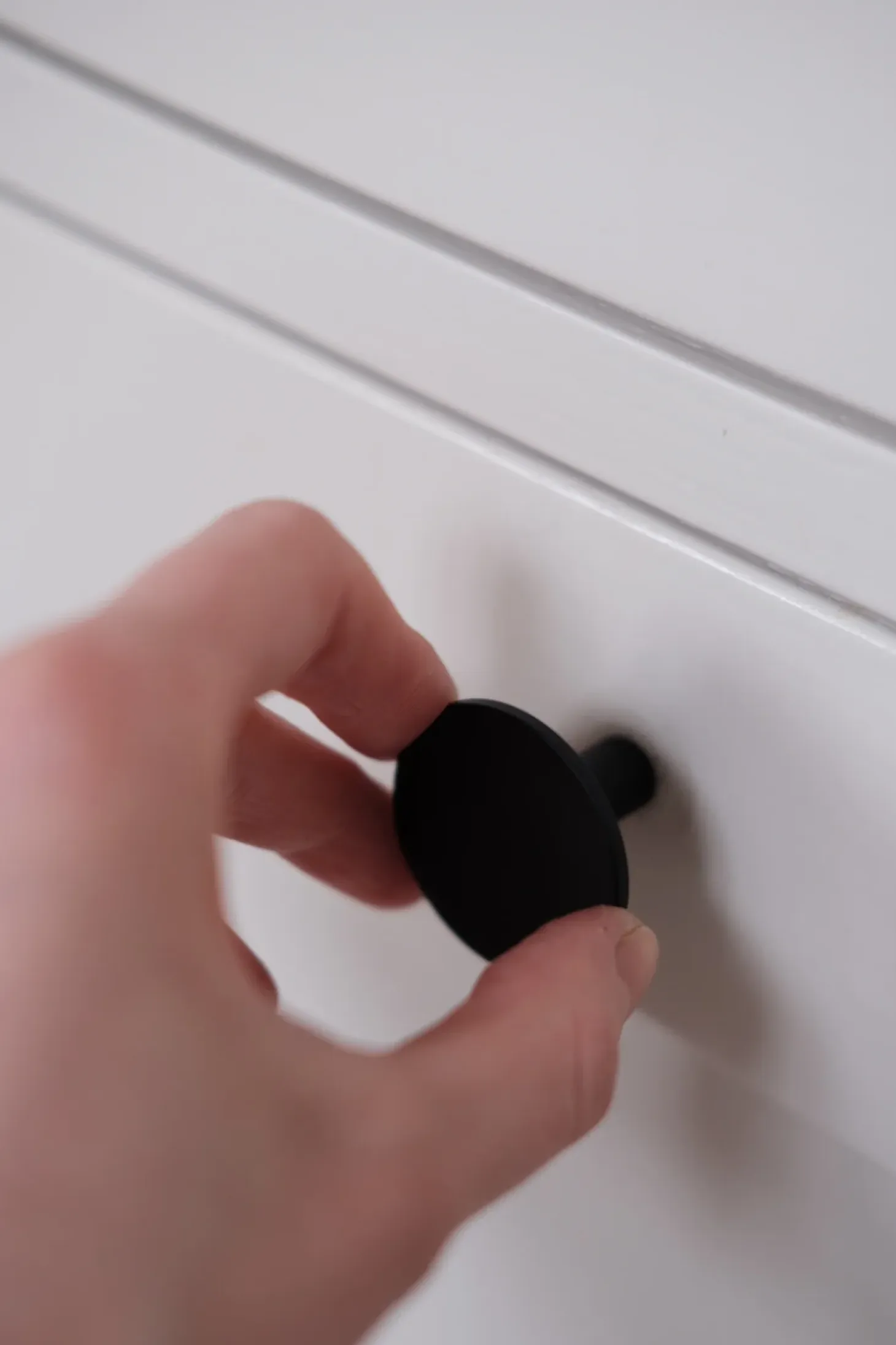En møbelknap, som er et enkelt og anvendeligt greb. Kan benyttes i væg såvel som på skab.