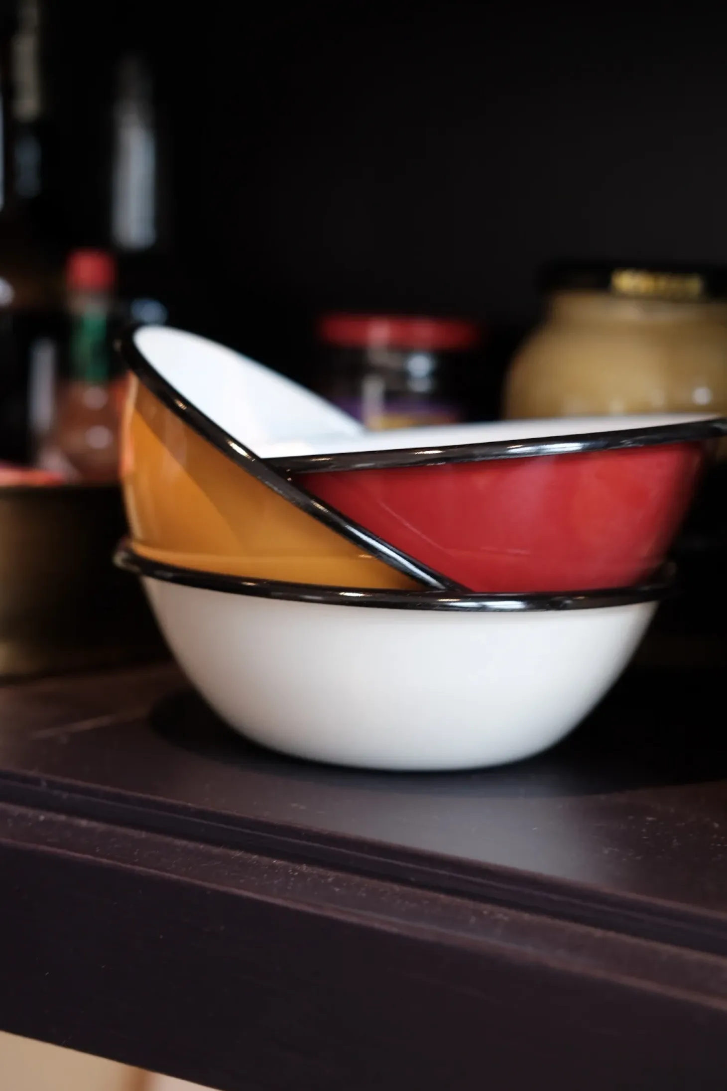 Morgenmadskålen i emalje. Skålen har en helt perfekt størrelse til yoghurt, jordbær eller f.eks chips. Den er er også ret velegnet at medbringe til en picnic, da den både er meget hårdfør og næsten ikke vejer noget.