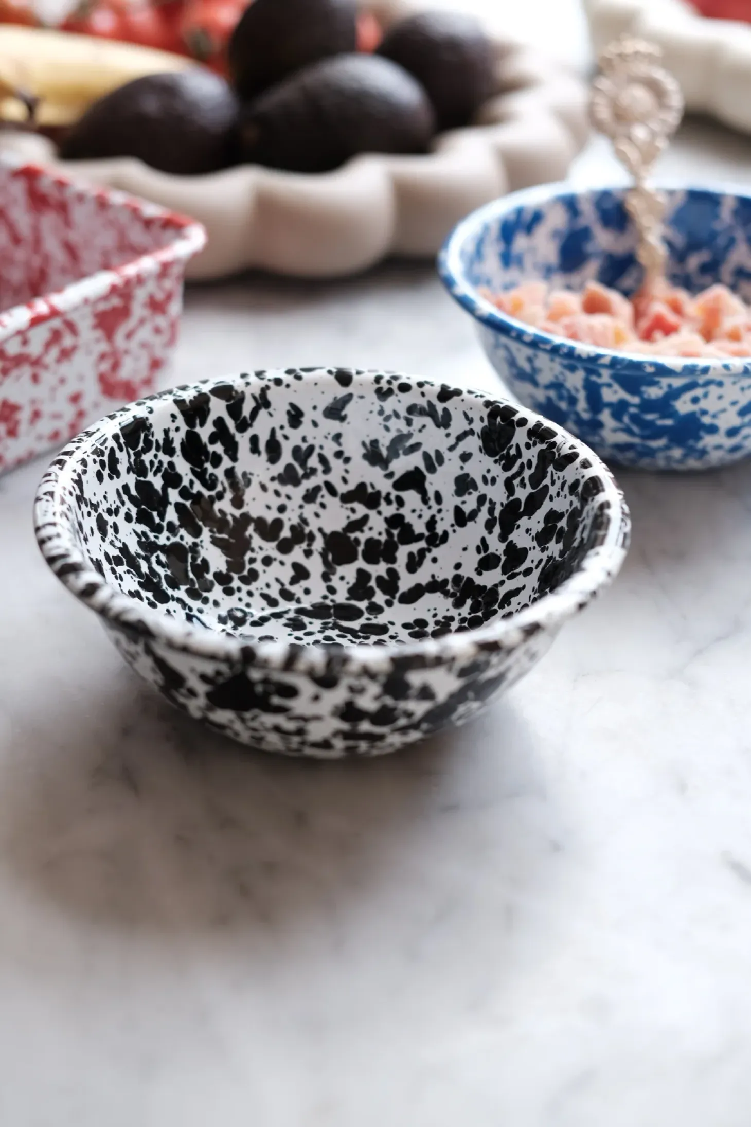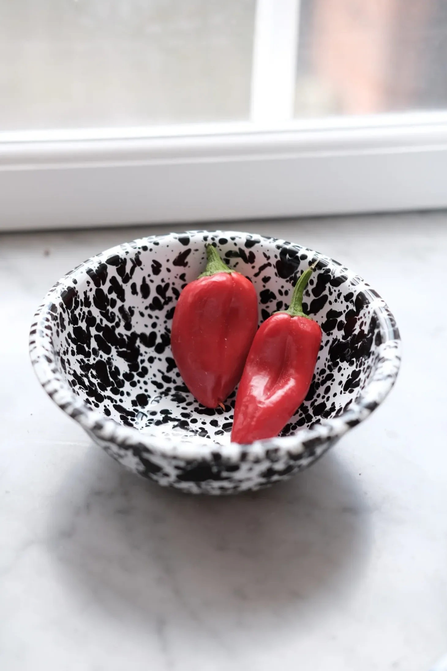 Morgenmadskålen i emalje fra amerikanse Crow Canyon er et af vores mest populære produkter. Den har en rigtig god størrelse i forhold til ja, bl.a. din morgenmad. Det flotte splatter mønster i sort og hvid er fint til både havregrød, kirsebær … eller chips.