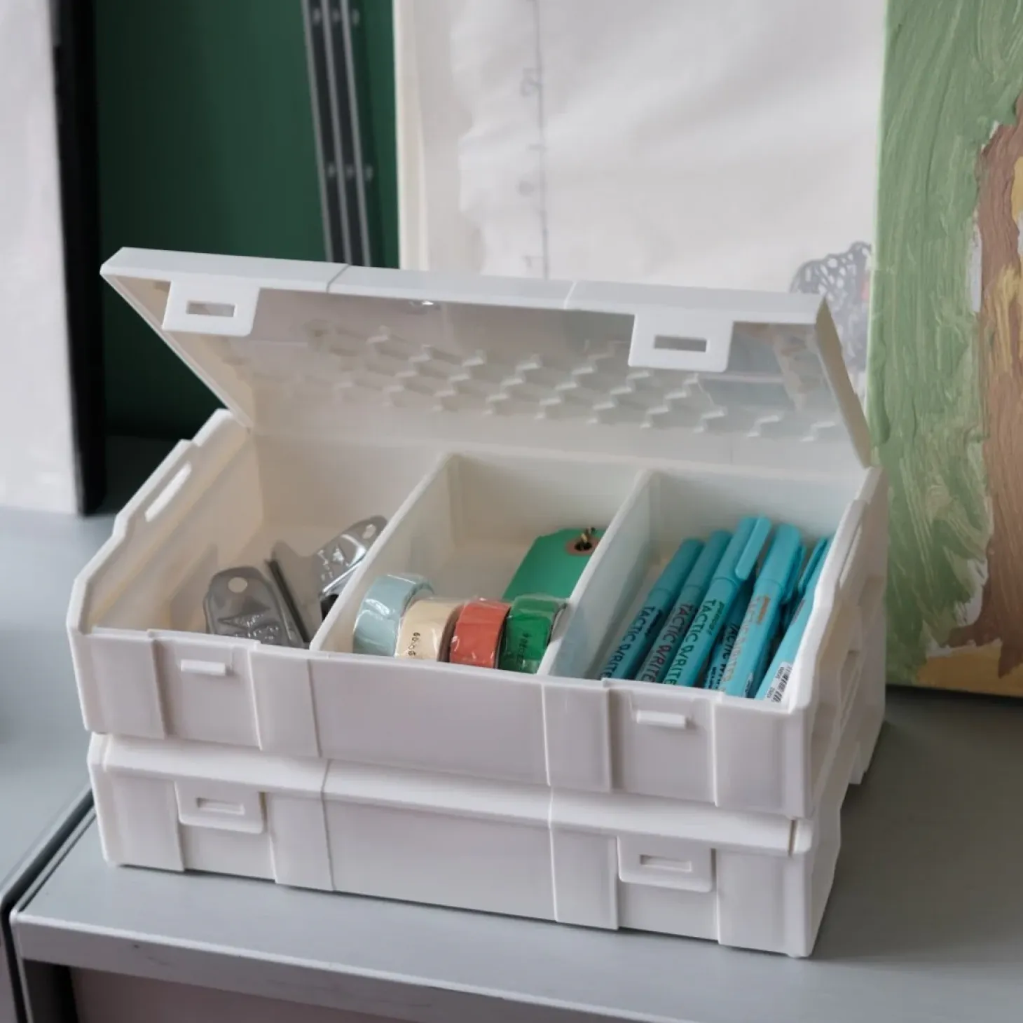 En smart opbevaringskasse med hank, så den nemt kan tages med. Brug den til f.eks. børnenes tegnegrej, på dit skrivebord eller til andre ting, man tager fra skabet og ud på bordet. Den er selvfølgelig også perfekt til søm, skruer og alt fra værkstedet. Og så kan den stabels og klikkes sammen, så smart!
