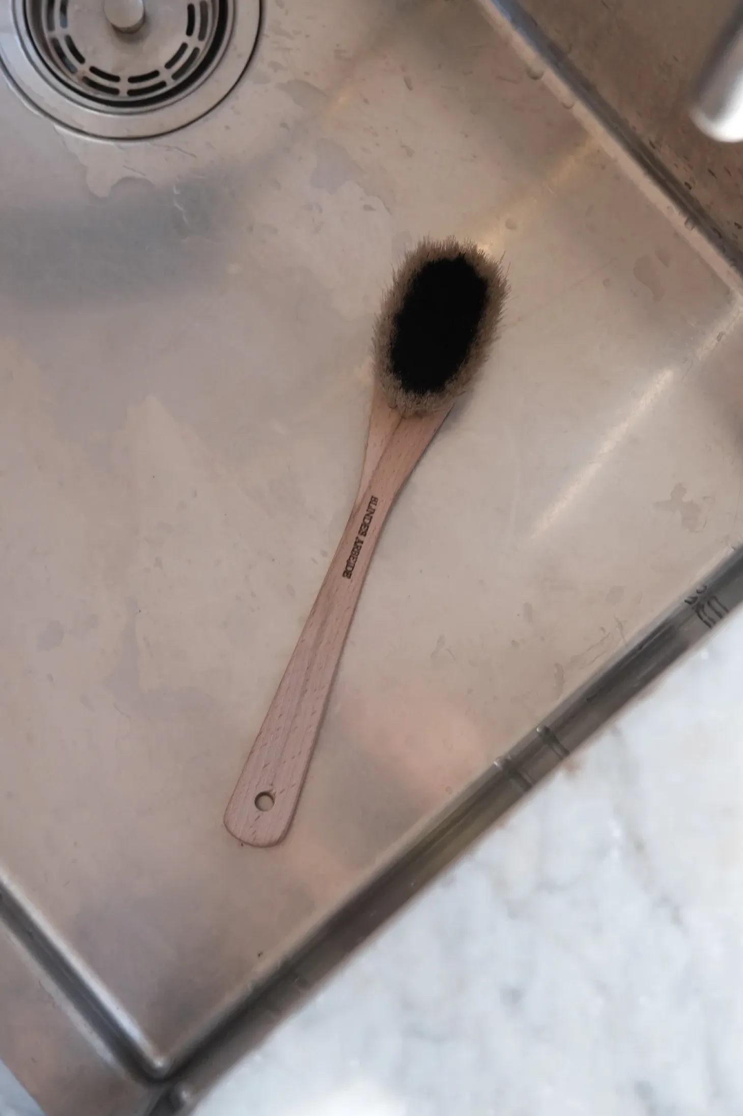 Opvaskebørsten er fremstillet i certificeret bæredygtigt bøgetræ med dyrlægekontrolleret hestehår.