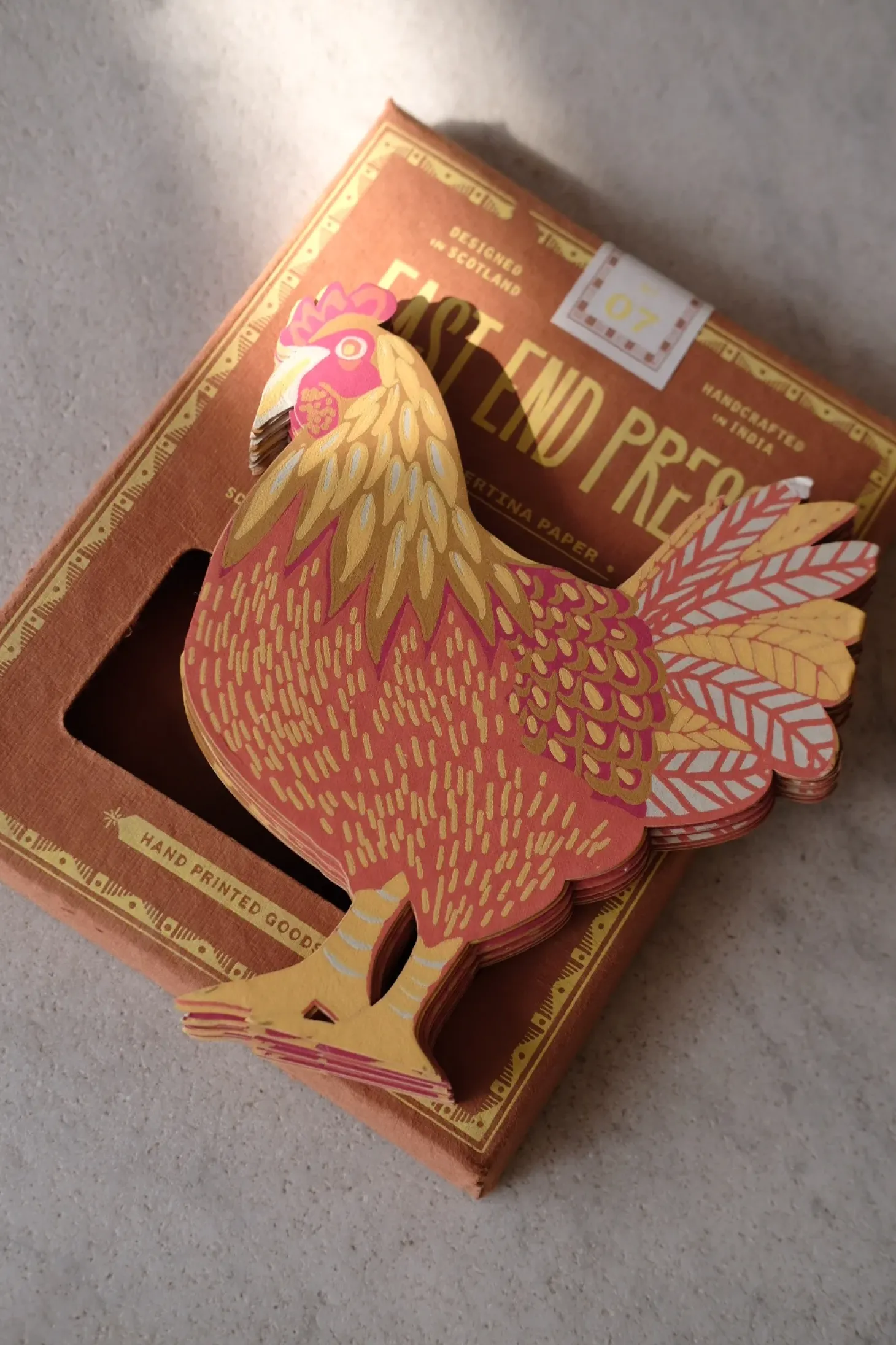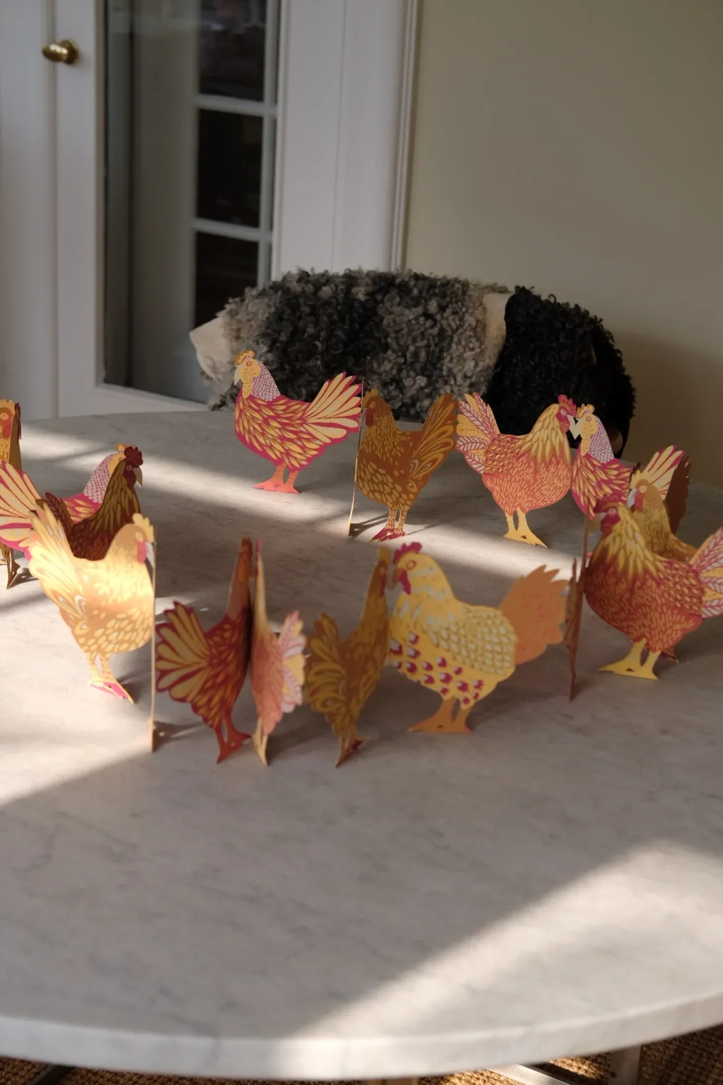 En farverig kylling med mønstrede fjer og vinger gentager sig langs længden af denne foldede krans, perfekt til forårsdekoration eller tilføjelse af sjov til dit køkken.
