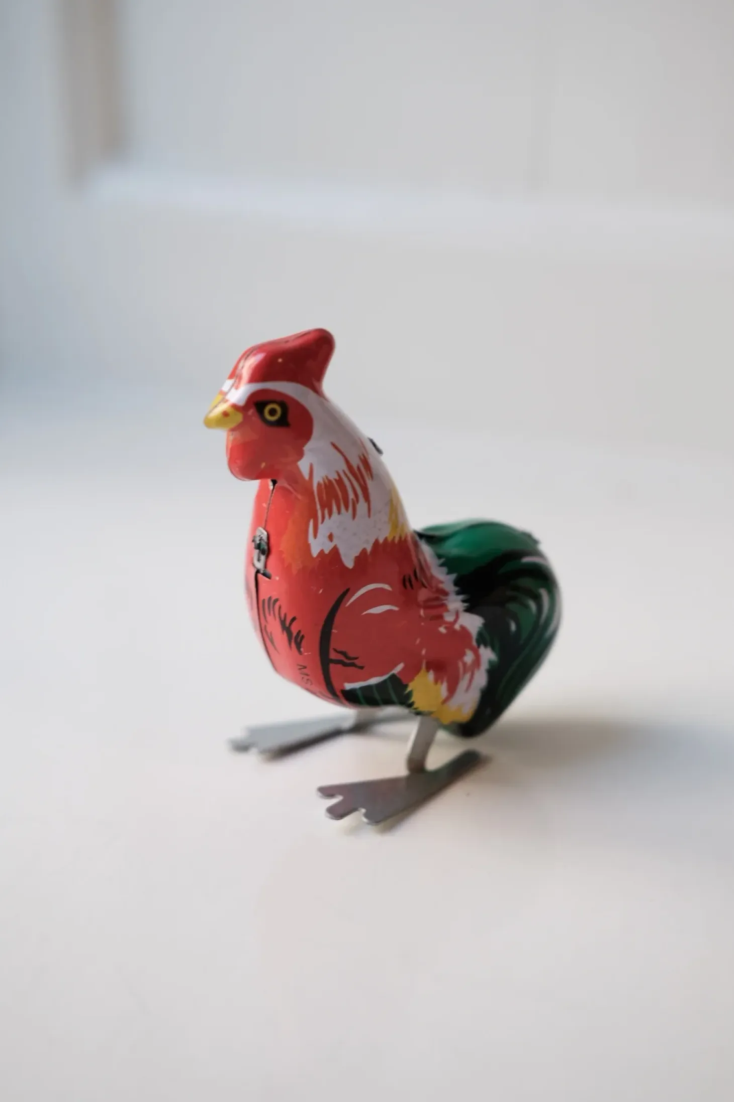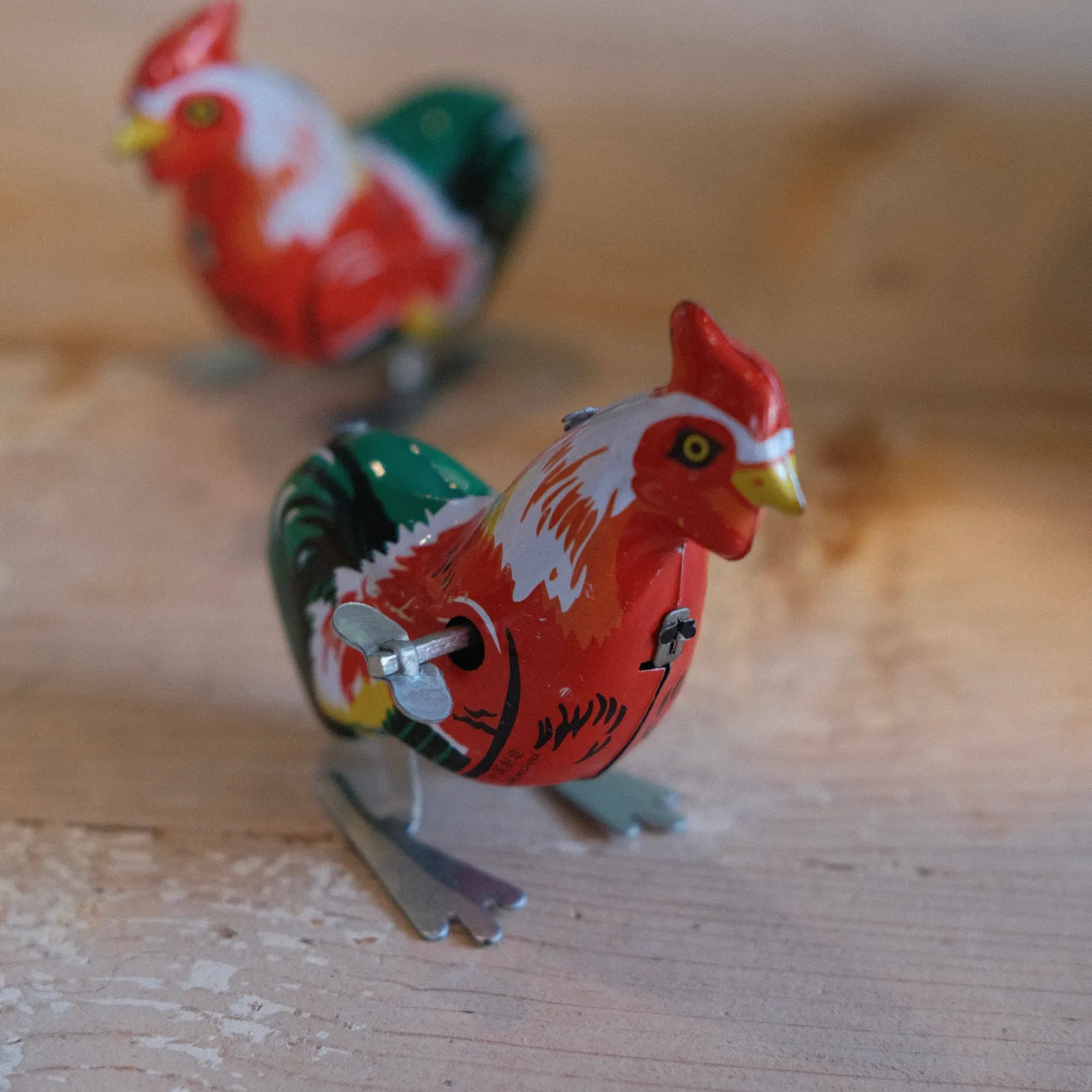 Dekorativ hane i metal, som kan trækkes op, så den hopper rundt.