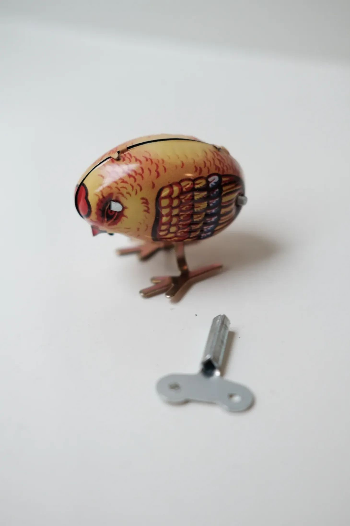 Dekorativ kylling i metal, som kan trækkes op, så den hopper rundt.