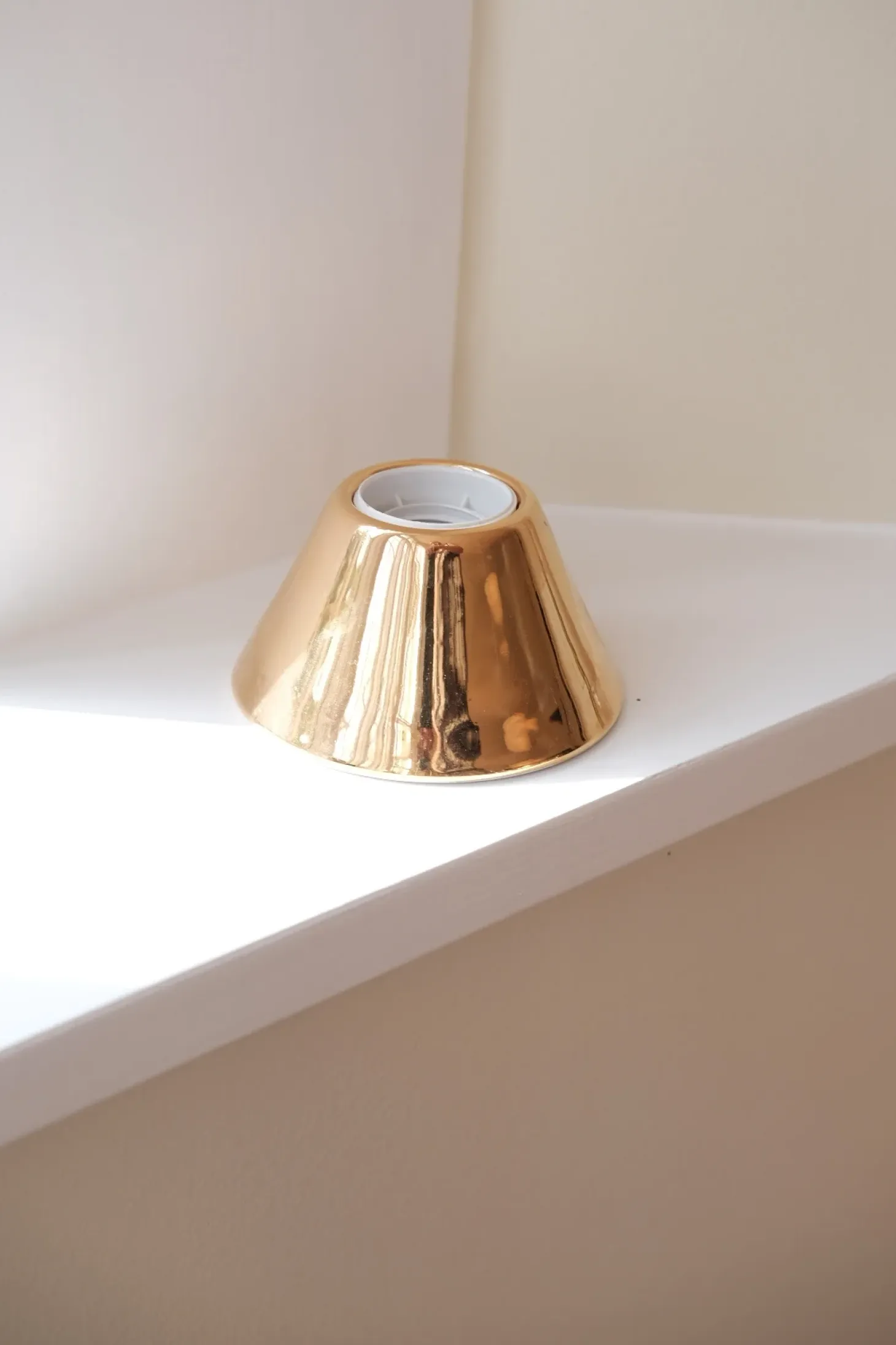 Det er en porcelænslampe, der er belagt med 18k guld. Den vil med tiden få den skønneste patina, hvis man ikke pudser den op.