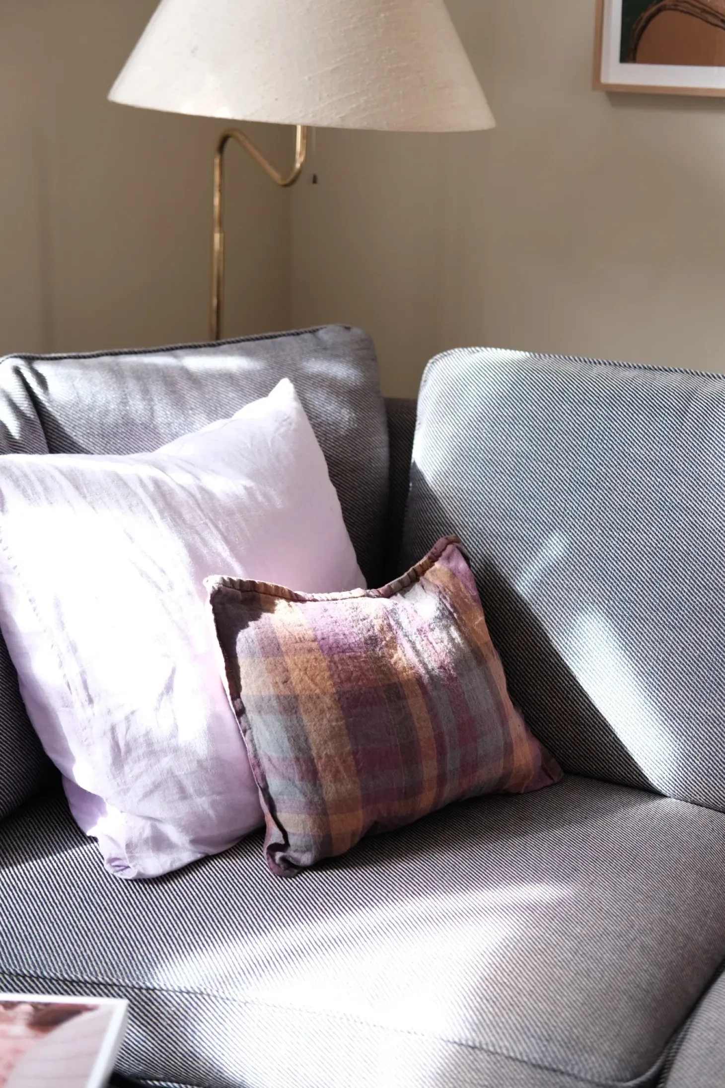 Pude i vasket hør i en smukt tern fra franske Linge Particulier. De kan virkelig noget med farver – de er særligt dybe og flotte.