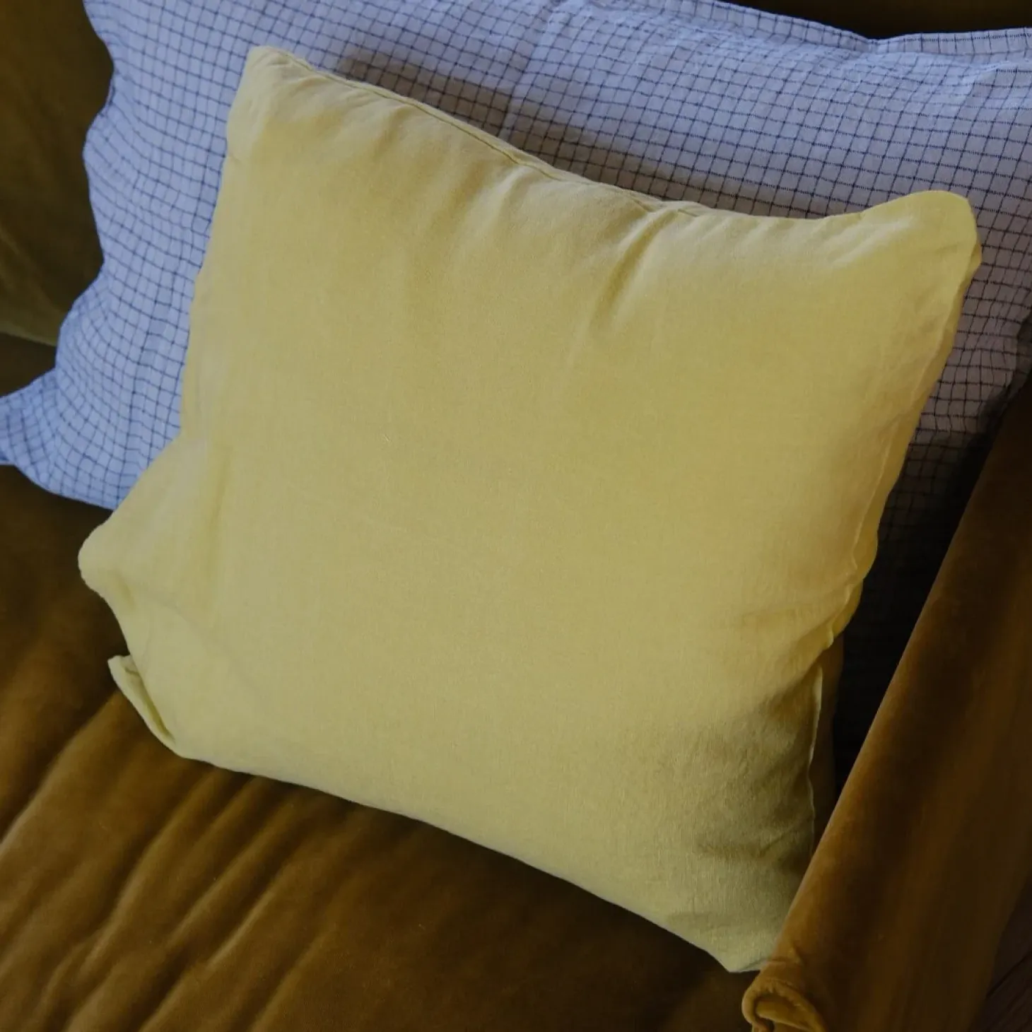 En skøn pude i hør fra franske Linge Particulier. Puden er lavet af vævet hør, der bagefter er vasket, hvilket giver en helt særlig, blød og holdbar kvalitet, der bare bliver blødere og blødere efter hver vask. Her i en syregul farve.