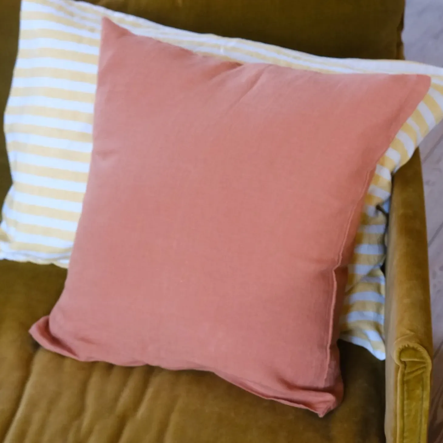 En skøn pude i hør fra franske Linge Particulier. Puden er lavet af vævet hør, der bagefter er vasket, hvilket giver en helt særlig, blød og holdbar kvalitet, der bare bliver blødere og blødere efter hver vask. Her i en rødlig jordfarve farve.