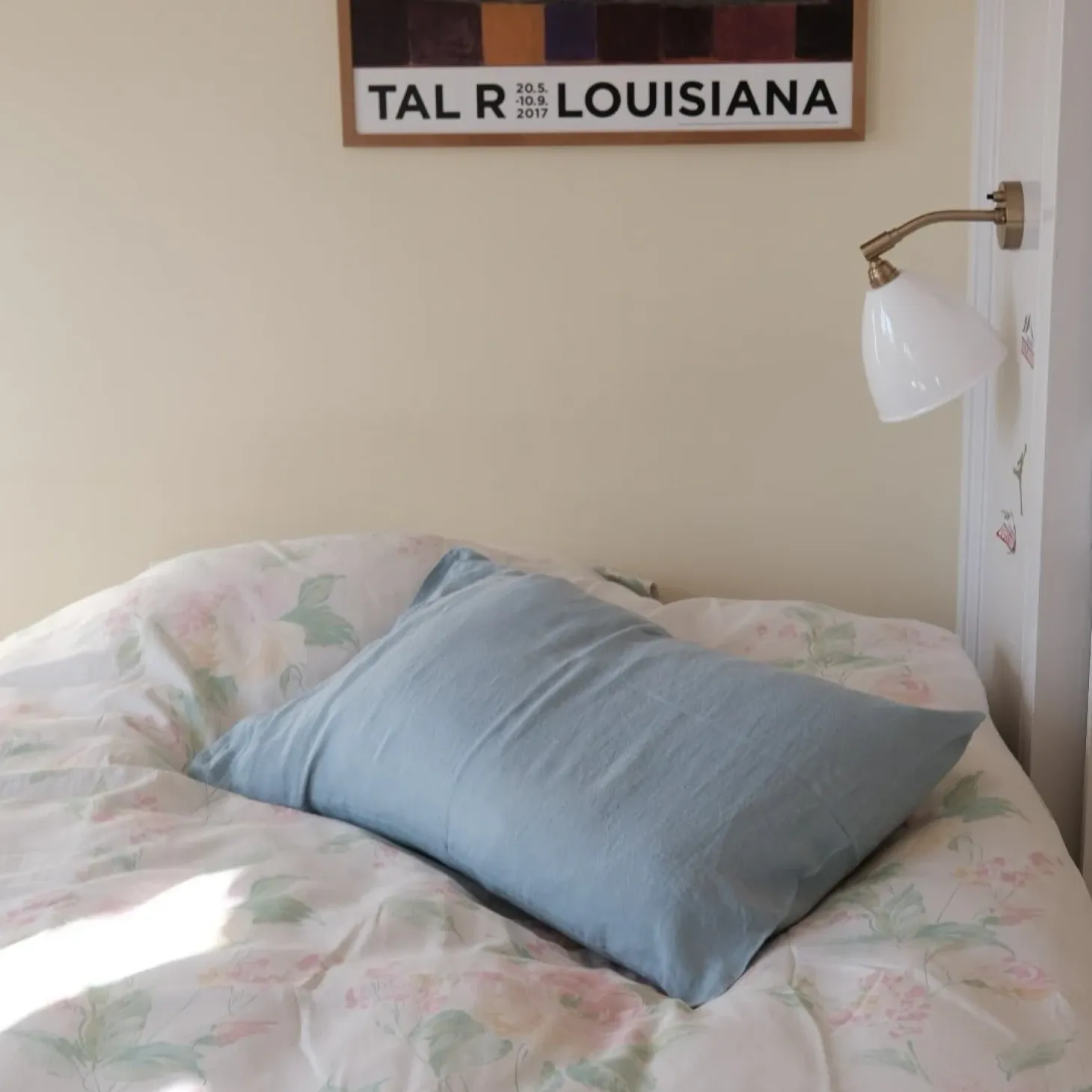 En fin lys blå hørpude fra franske Linge Particulier. Pudebetrækket er vævet i hør, hvorefter det er vasket, hvilket giver den meget lækre og bløde kvalitet, der bare bliver blødere og blødere ved brug. Jeg elsker at bruge denne størrelse i sengen som ‘læsepude’ og udendørs i en kurvestol.