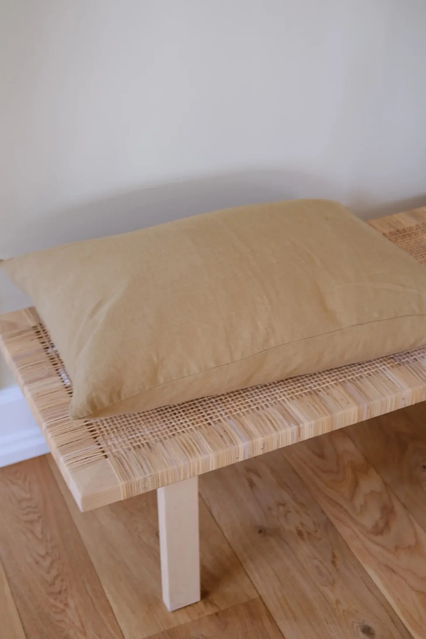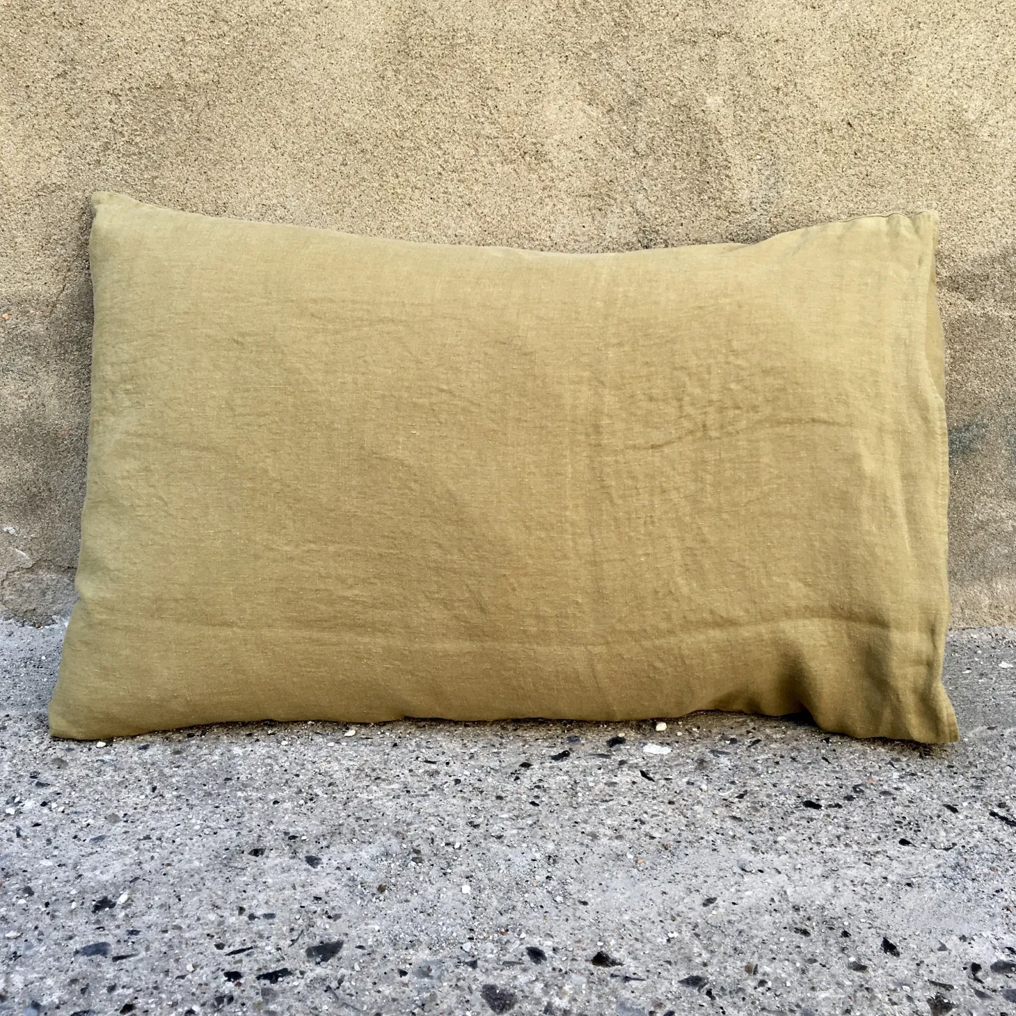 En lækker stor hørpude fra franske Linge Particulier i en skøn karrygul. De kan bare noget helt særligt med farver… Pudebetrækket er lavet i vævet hør, der bagefter er vasket, hvilket giver en helt særlig, blød og holdbar kvalitet, der bare bliver blødere og blødere efter hver vask. Jeg elsker at bruge denne størrelse i sengen som ‘læsepude’ og udendørs i en kurvestol.