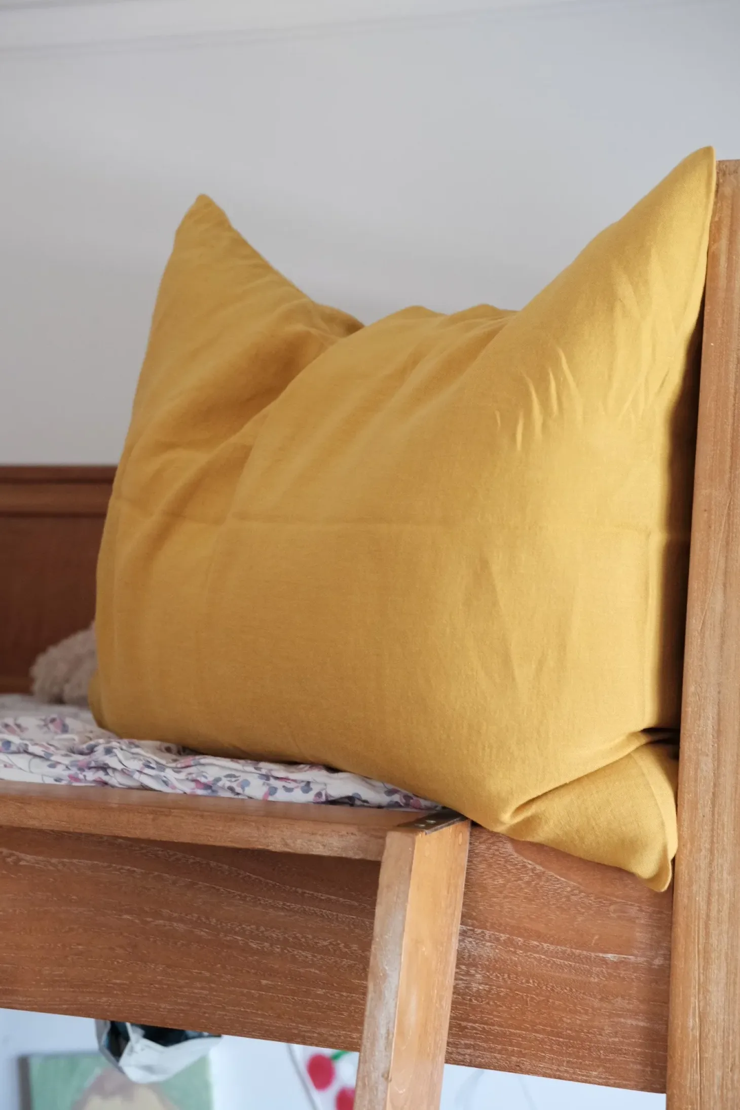 En lækker stor hørpude fra franske Linge Particulier i en dejlig honninggul. De kan bare noget helt særligt med farver… Pudebetrækket er lavet i vævet hør, der bagefter er vasket, hvilket giver en helt særlig, blød og holdbar kvalitet, der bare bliver blødere og blødere efter hver vask. Jeg elsker at bruge denne størrelse i sengen som ‘læsepude’ og udendørs i en kurvestol.