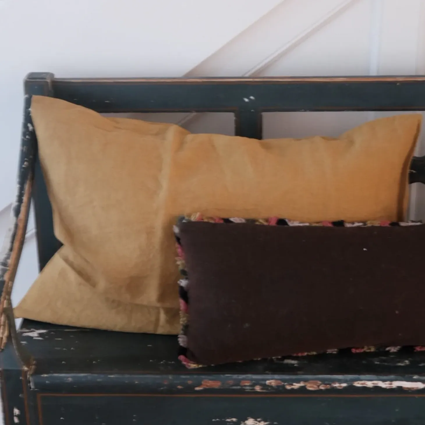 En skøn grøn hørpude fra franske Linge Particulier. Pudebetrækket er vævet i hør, hvorefter det er vasket, hvilket giver den meget lækre og bløde kvalitet, der bare bliver blødere og blødere ved brug. Jeg elsker at bruge denne størrelse i sengen som ‘læsepude’ og udendørs i en kurvestol.
