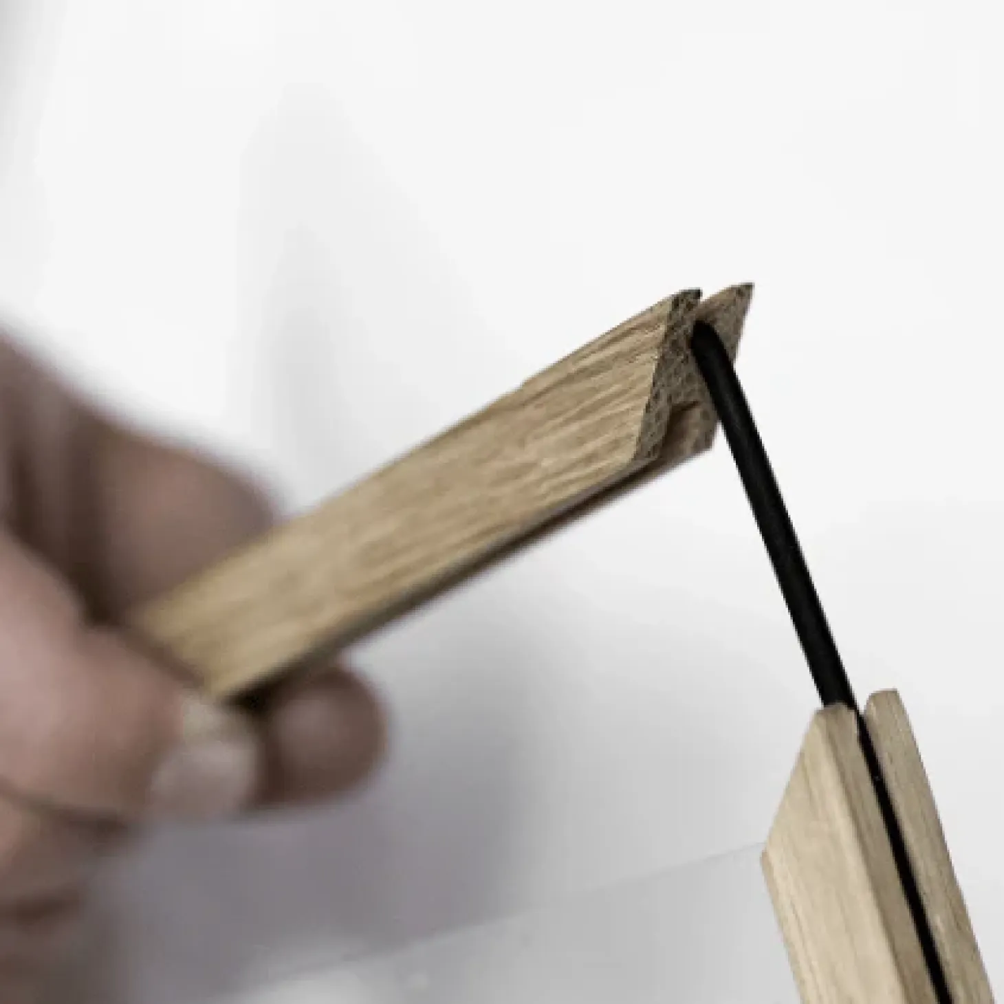 Smuk ramme i egetræ med plexiglas. Rammen holdes sammen af en elastik, så man kan kalde det en moderne skifteramme. Elastikken gør det nemt at skifte billedet og fungerer samtidig som ophæng.