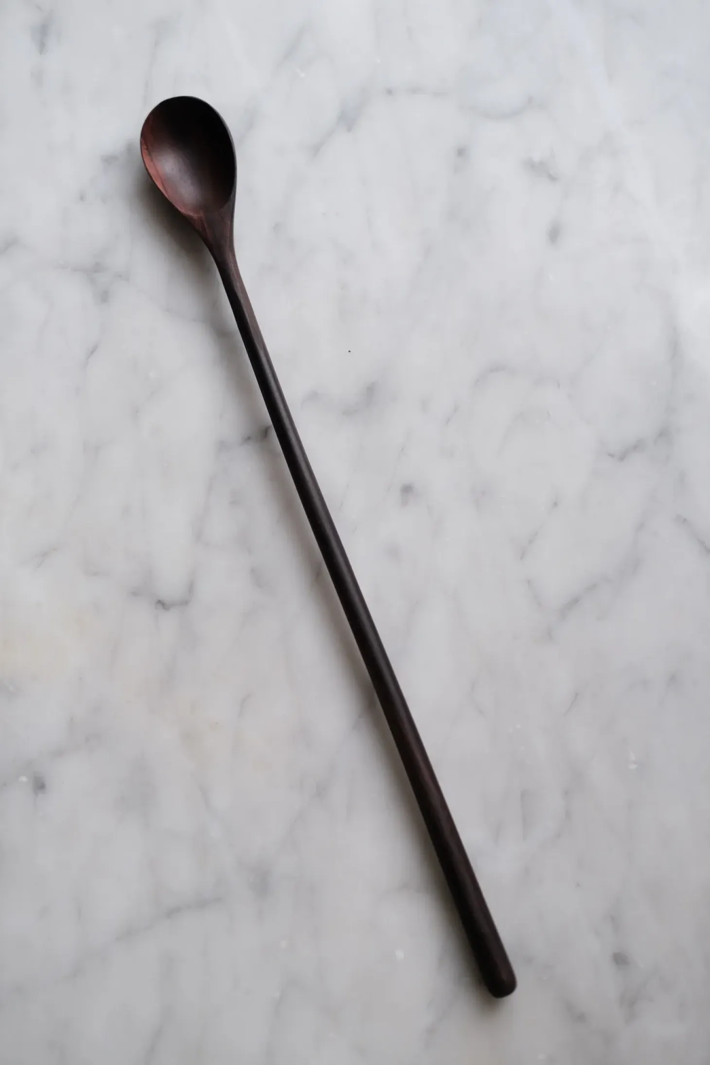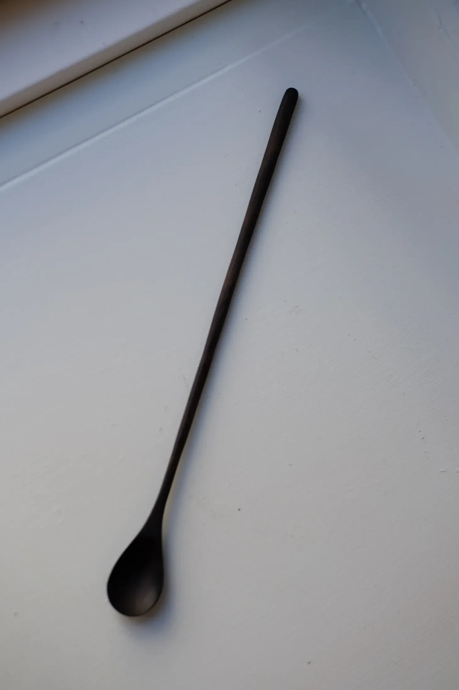 En teak ske i et smukt formsprog, som får sin mørke farve fra at være brændt. Vi er vilde med den. Den er fin til honning, marmelade eller morgenmaden.
