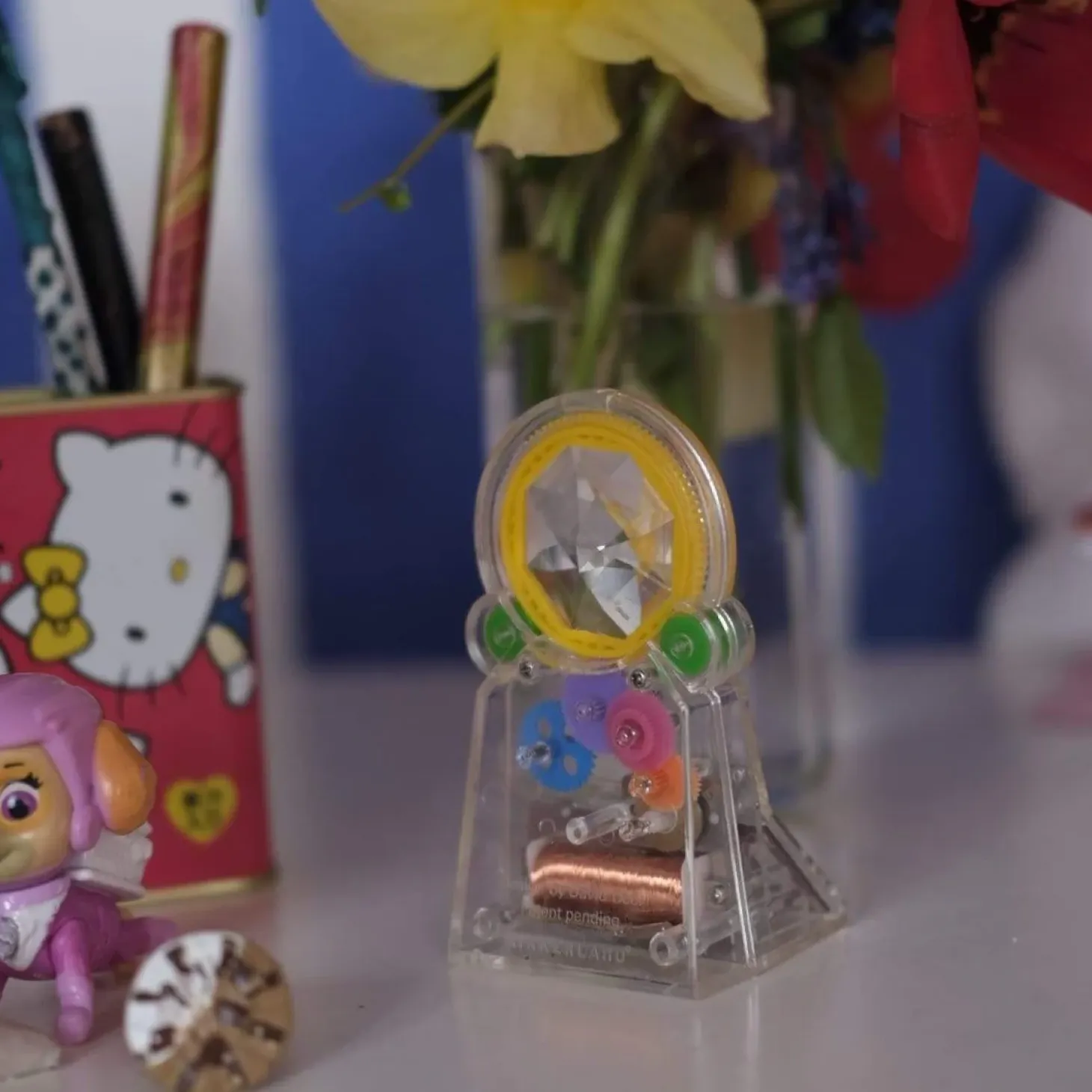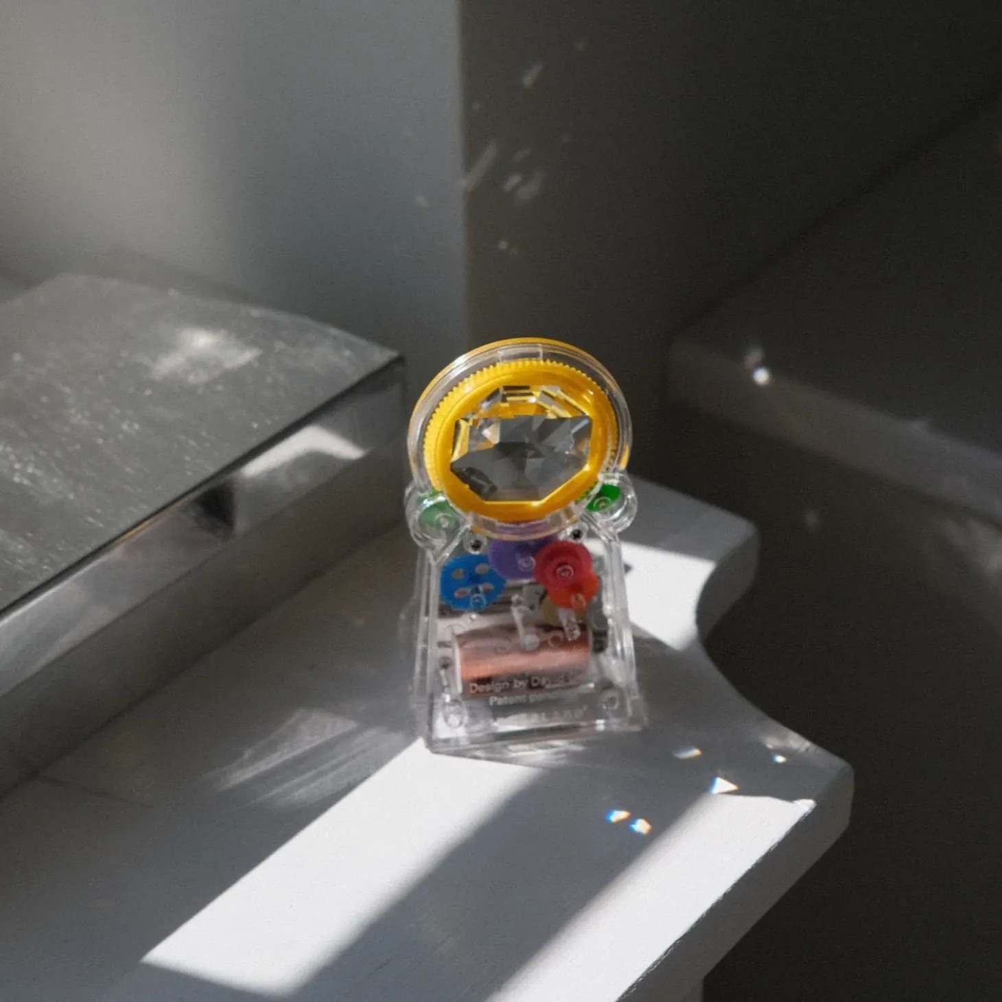 Andet: virker ved solen der varmer et lille solpanel på regnbuemagerens fod.