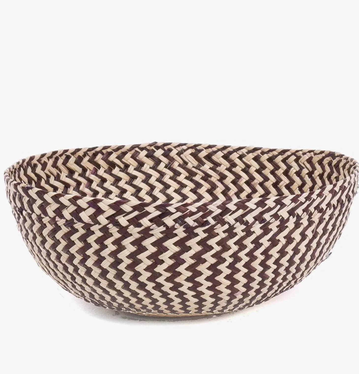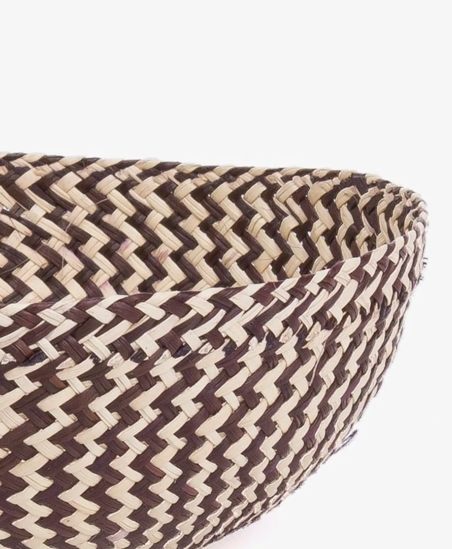 En hyggelige lille skål i lyse samt brune palmeplade.Mønster og materiale er interessant og skønt sammen med alt det porcelæn, stål og glas jeg har i skabene. Den passer godt ind et utal af steder i dit hjem. Det naturlige materiale bløder op og skaber stemning.