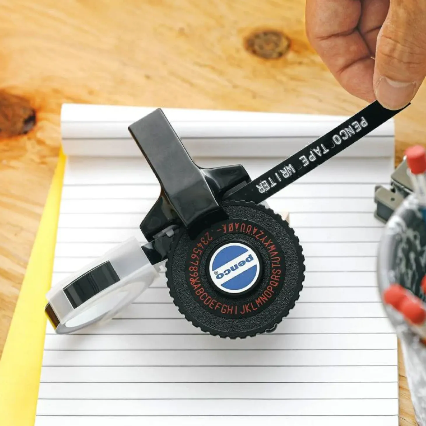 Oldschool mærkatskriver der præger plasten. De prægede mærkater kan bruges på børnenes kopper, tandpastakrus, over gæstehåndklædet og andre sjove steder.