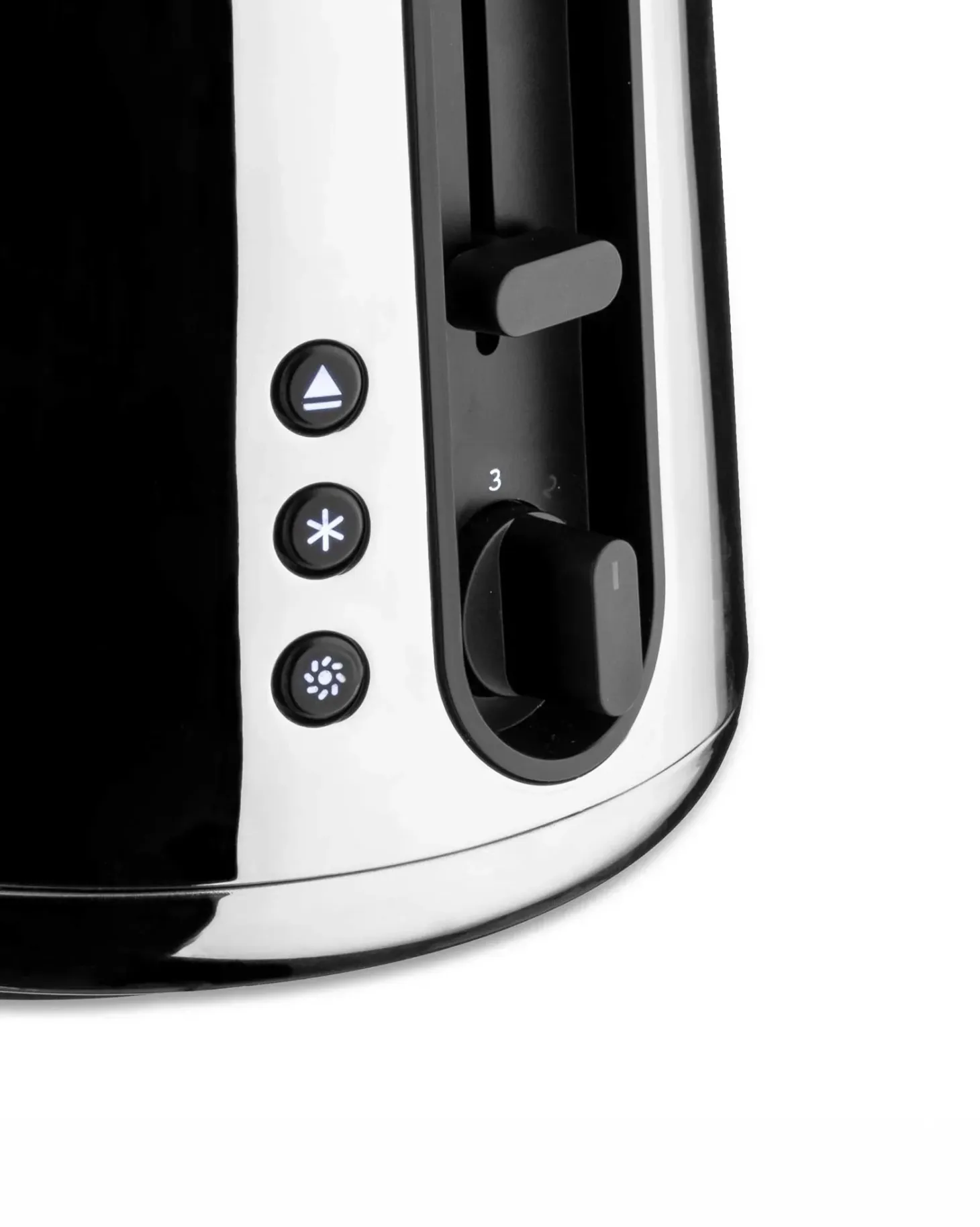 Den flotte toaster har plads til at riste to skiver brød ad gangen og er udstyret med trinløs indstilling af den ønskede ristningsgrad. Desuden har den en defrost funktion, der gør det muligt at optø brødet inden ristningen. Dens praktiske krummebakke gør det nemt at rengøre brødristeren for krummer efter brug.