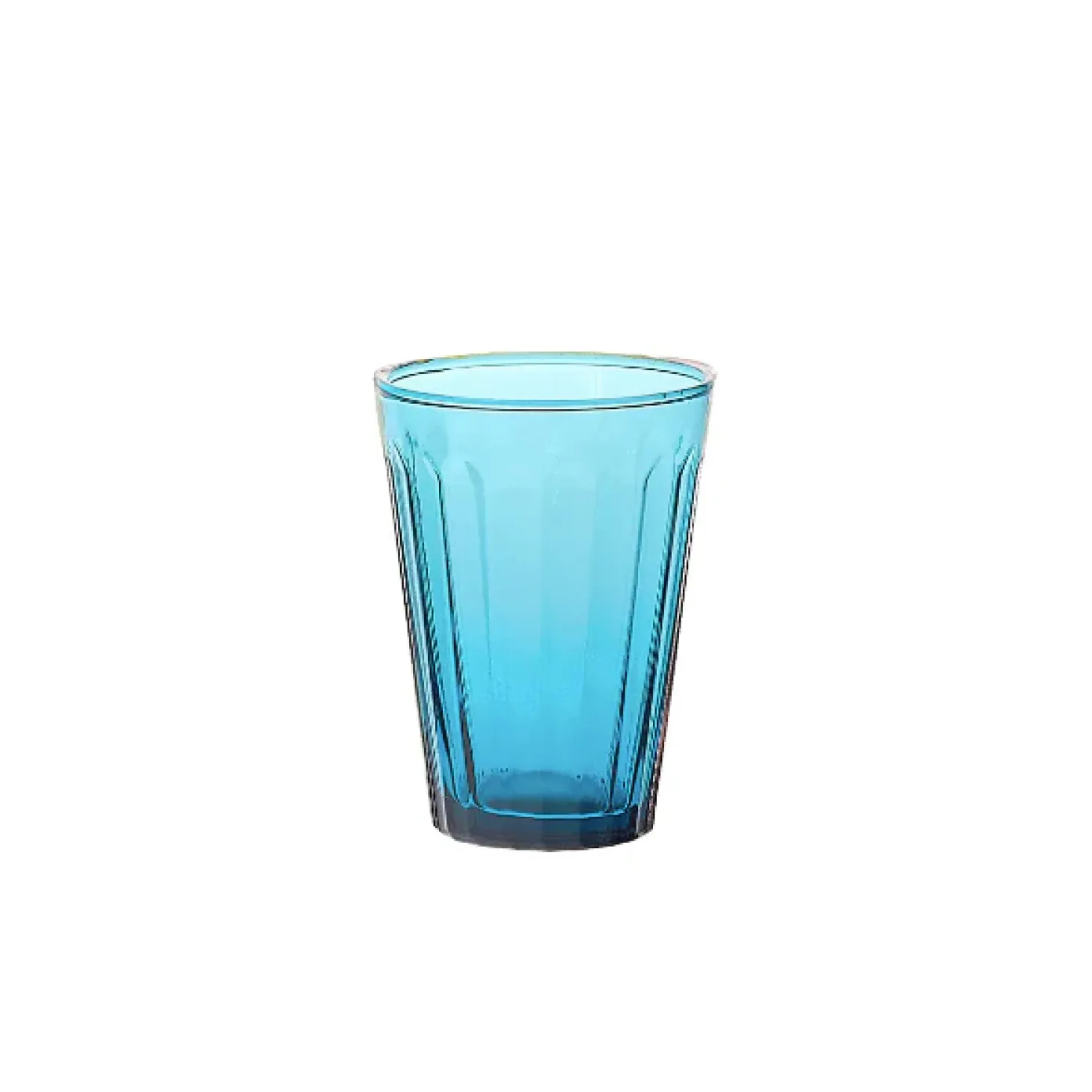 Et vandglas, men som man kalder et vinglas i Italien. Det er mundblæst i de smukkeste farver. De har et par riller, og det gør farven endnu smukkere for så kommer der lidt spil i. Det giver en meget smuk borddækning at bruge farvede glas – det giver et indtryk af at man har gjort sig umage.