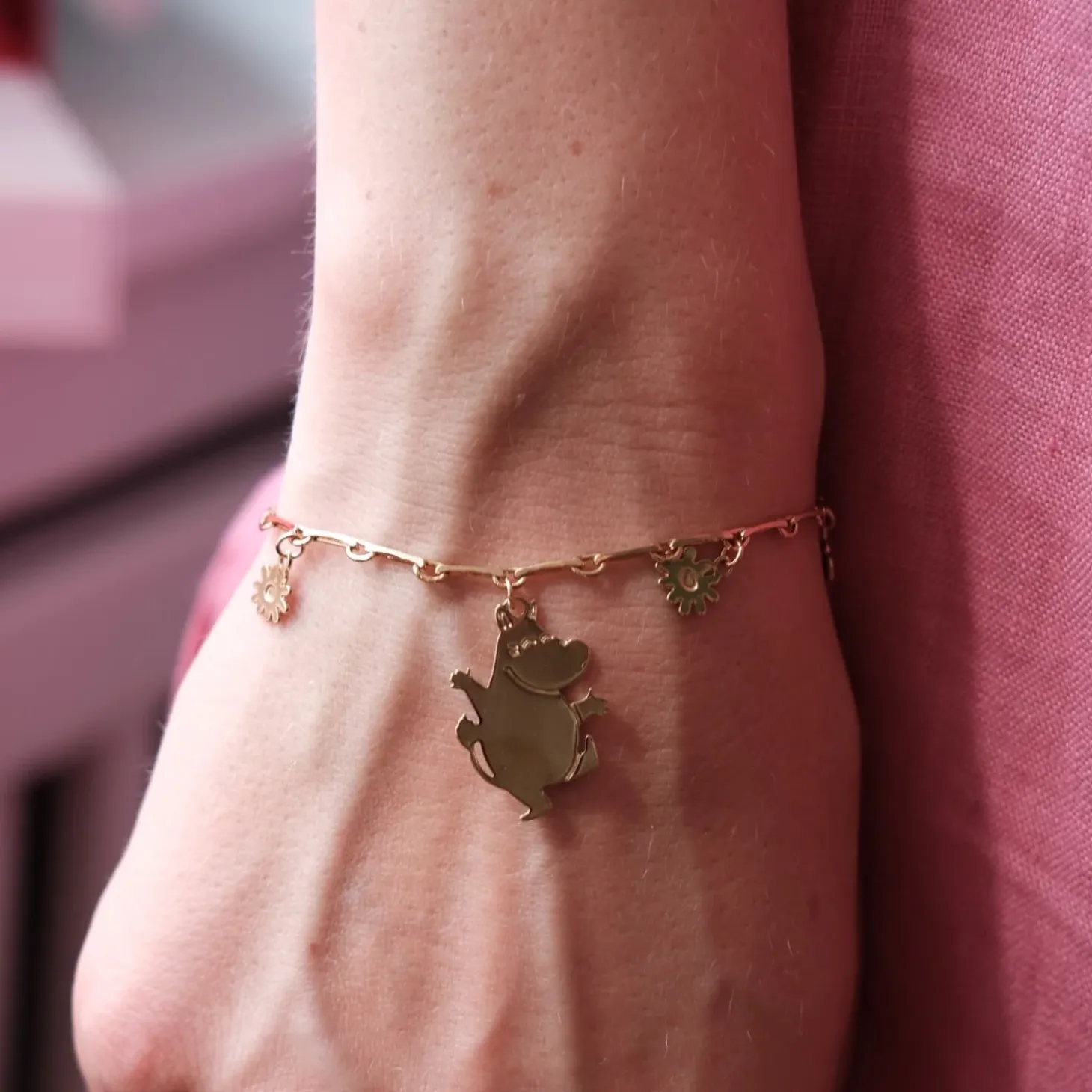 Den cool og fine armbånd med finske Moomin der hopper. De andre charms er billeder af skyer og blomster. Det er lavet i 24 karat forgyldt messing. Armbåndet er kreeret af den seje tyske designer Malaika Raiss. Virkelig fin både alene og sammen med ens andre kæder. Og en perfekt gave…