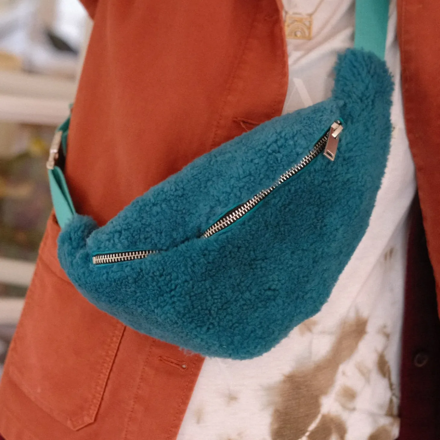En bæltetaske fra franske Toasties. Den er lavet i lammeskind, der er indfarvet. Lammeskindet er ekstrem holdbart, så du kan godt regne med at kunne bruge den dagligt i mange år frem. Stroppen er lang nok til at de fleste vil kunne have den på, på tværs af overkroppen. Den har en stor lomme froan, samt en mindre skjult lomme bagpå.