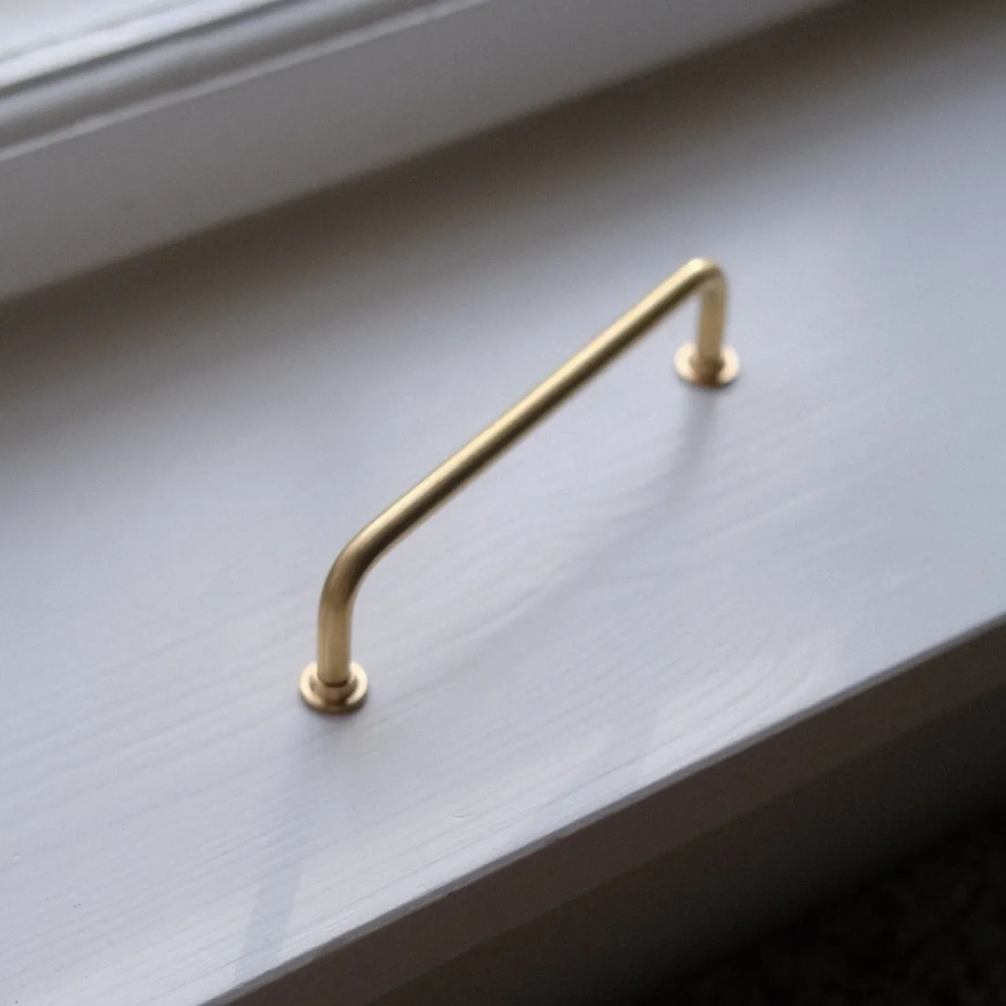 Super fine bøjlegreb i upoleret messing med trappet fodskive, hvilket tilføjer elegance til det klassiske greb.