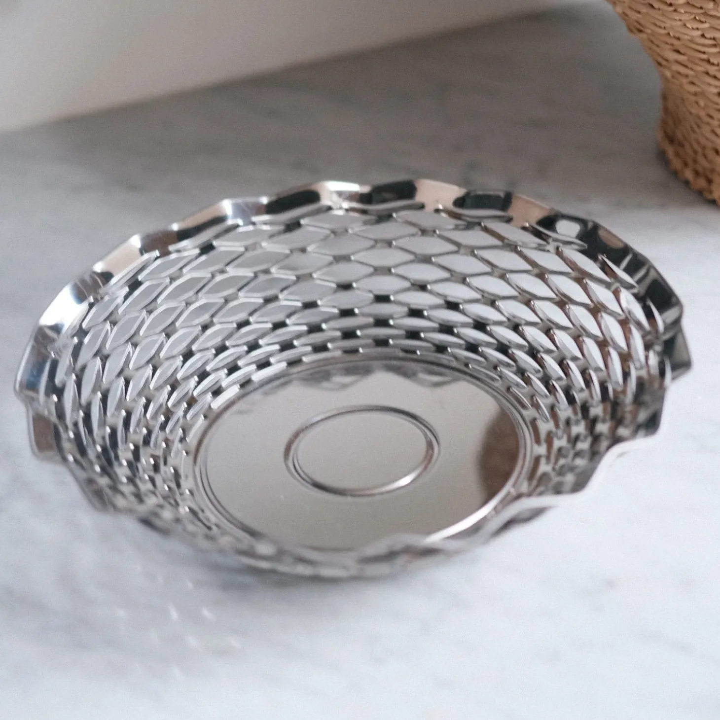 En brødkurv presset ud i rustfrit stål. Den er cool og fin på samme tid. Brug til brød, frugt, kager og anden servering.Roger Orfevre er fransk og deres vare har en skøn attitude. Vi er vilde med det kolde stål og den organiske form.
