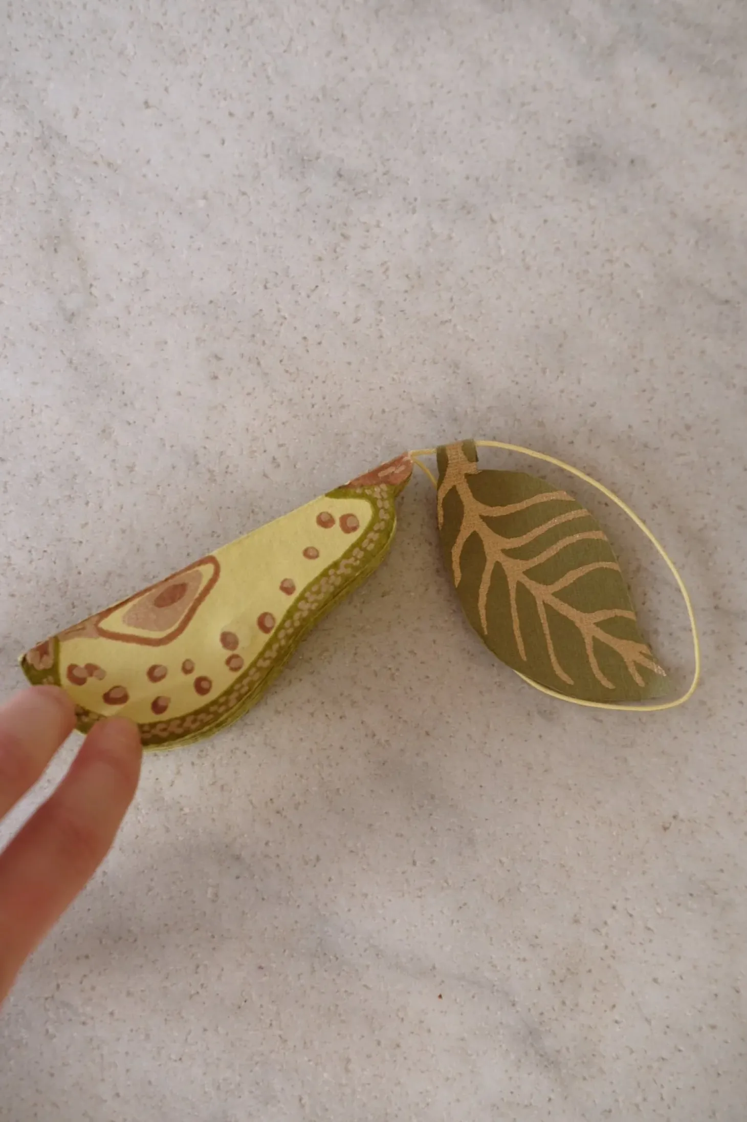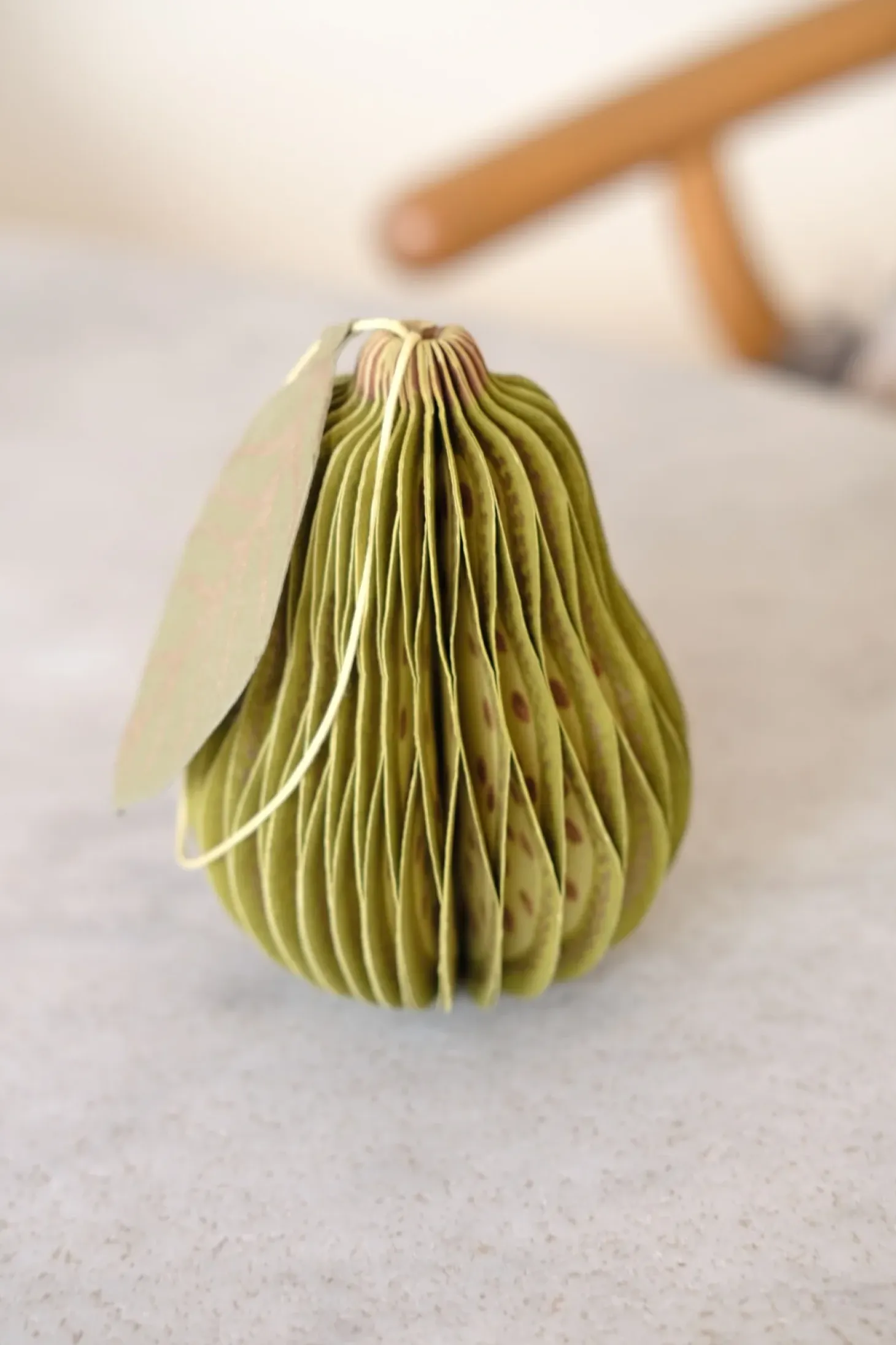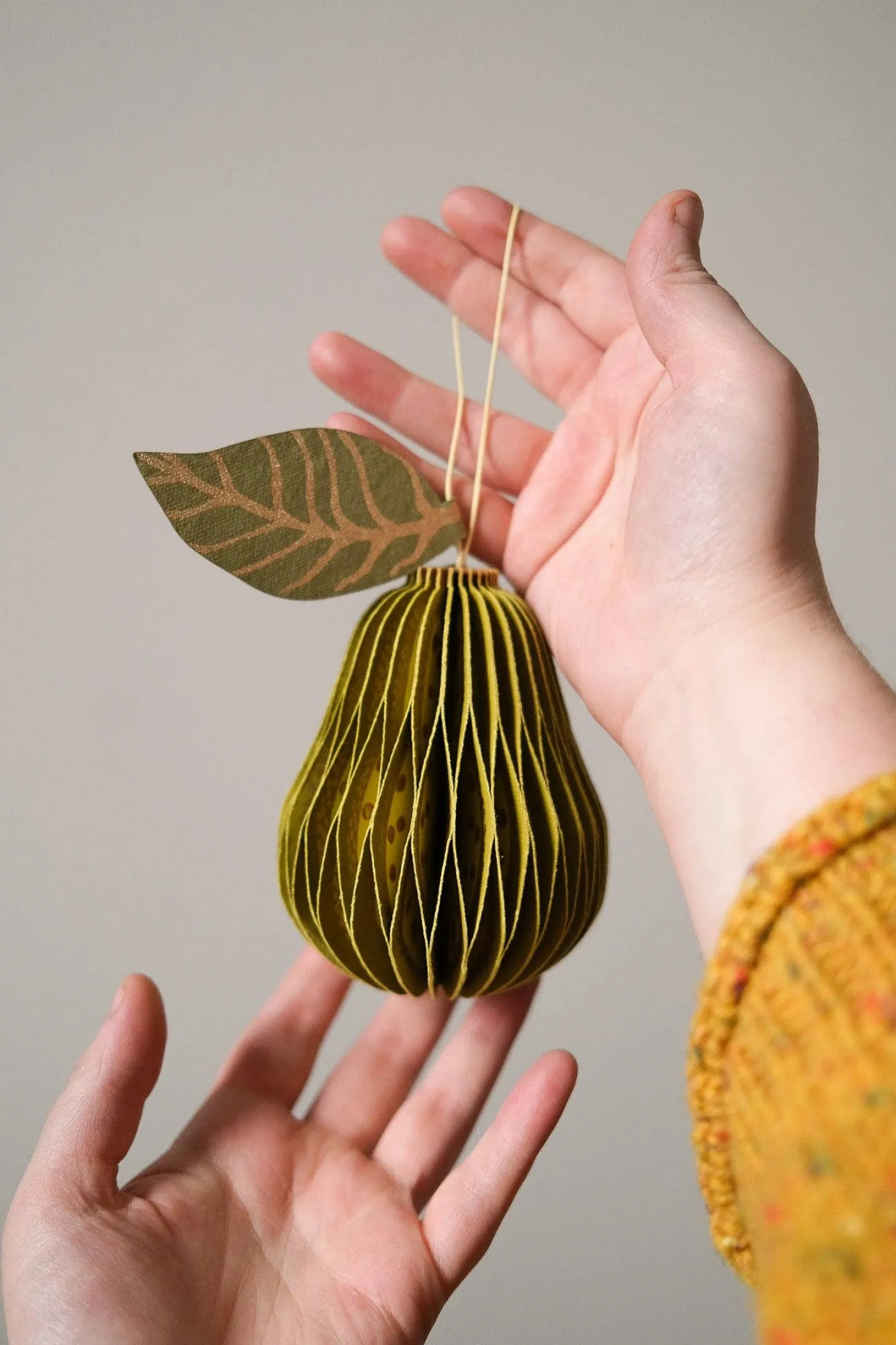 En pæreformet papirpynt med en bomuldssnor. Pæren sikres med en magnet.