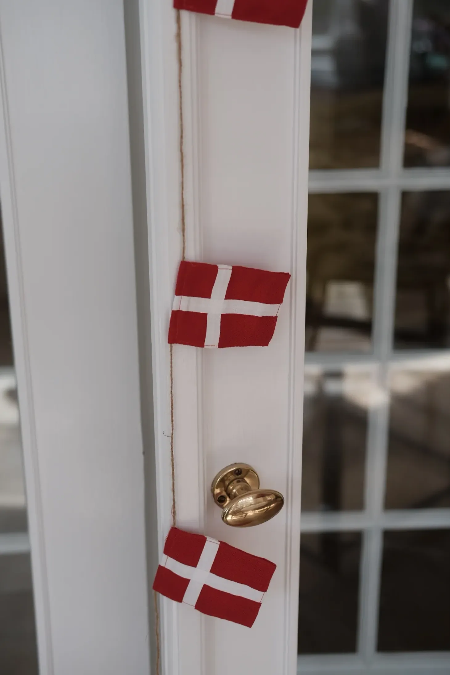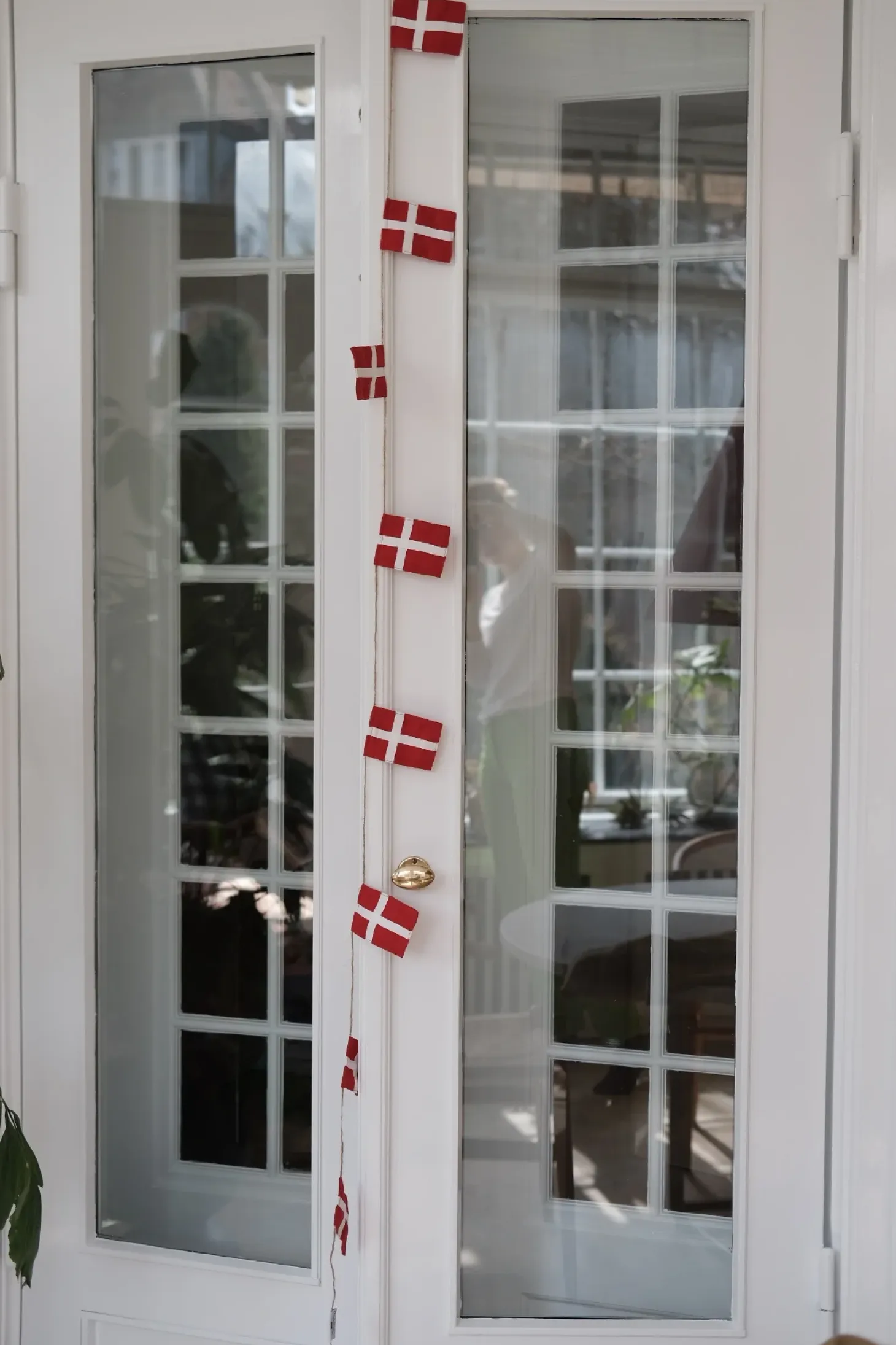 Her er 10 syede danske flag, syet af ægte flagdug, på en rå jutesnor. Flagranken kan bruges i mange festlige anledninger. Både på et (stort) juletræ, til fødselsdag eller studenterfest. Flagranken kommer i en lille broderet lærredspose, så de kan gemmes og bruges år efter år efter år.